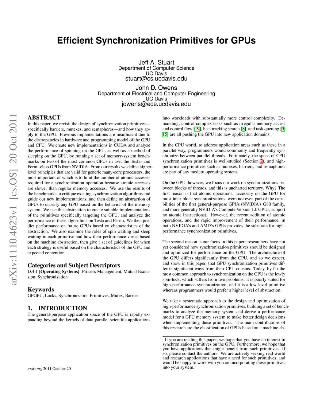 In this paper, we revisit the design of synchronization primitives---specifically barriers, mutexes, and semaphores---and how they apply to the GPU. Previous implementations are insufficient due to the discrepancies in hardware and programming model of the GPU and CPU. We create new implementations in CUDA and analyze the performance of spinning on the GPU, as well as a method of sleeping on the GPU, by running a set of memory-system benchmarks on two of the most common GPUs in use, the Tesla- and Fermi-class GPUs from NVIDIA. From our results we define higher-level principles that are valid for generic many-core processors, the most important of which is to limit the number of atomic accesses required for a synchronization operation because atomic accesses are slower than regular memory accesses. We use the results of the benchmarks to critique existing synchronization algorithms and guide our new implementations, and then define an abstraction of GPUs to classify any GPU based on the behavior of the memory system. We use this abstraction to create suitable implementations of the primitives specifically targeting the GPU, and analyze the performance of these algorithms on Tesla and Fermi. We then predict performance on future GPUs based on characteristics of the abstraction. We also examine the roles of spin waiting and sleep waiting in each primitive and how their performance varies based on the machine abstraction, then give a set of guidelines for when each strategy is useful based on the characteristics of the GPU and expected contention.