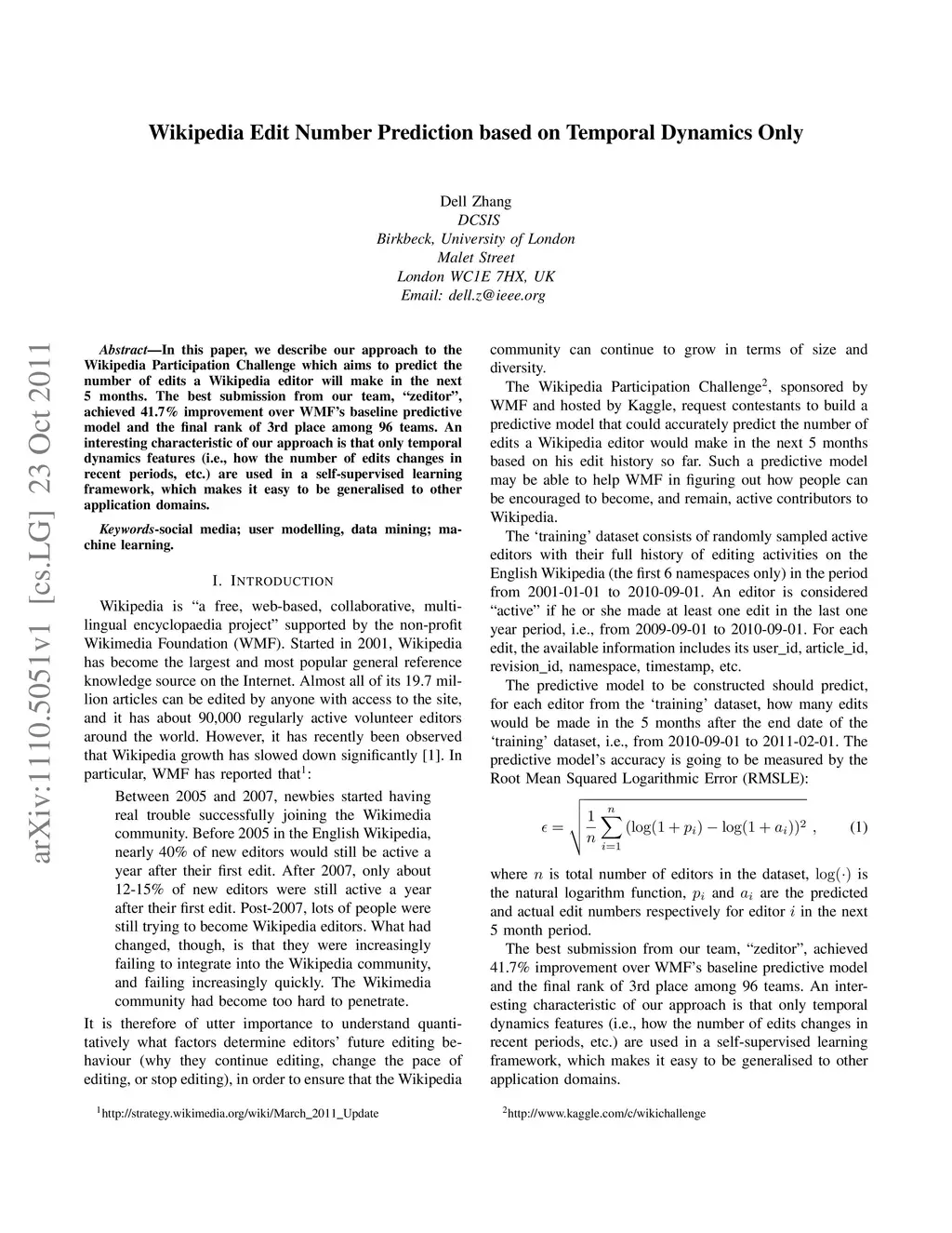 In this paper, we describe our approach to the Wikipedia Participation Challenge which aims to predict the number of edits a Wikipedia editor will make in the next 5 months. The best submission from our team, "zeditor", achieved 41.7% improvement over WMF's baseline predictive model and the final rank of 3rd place among 96 teams. An interesting characteristic of our approach is that only temporal dynamics features (i.e., how the number of edits changes in recent periods, etc.) are used in a self-supervised learning framework, which makes it easy to be generalised to other application domains.