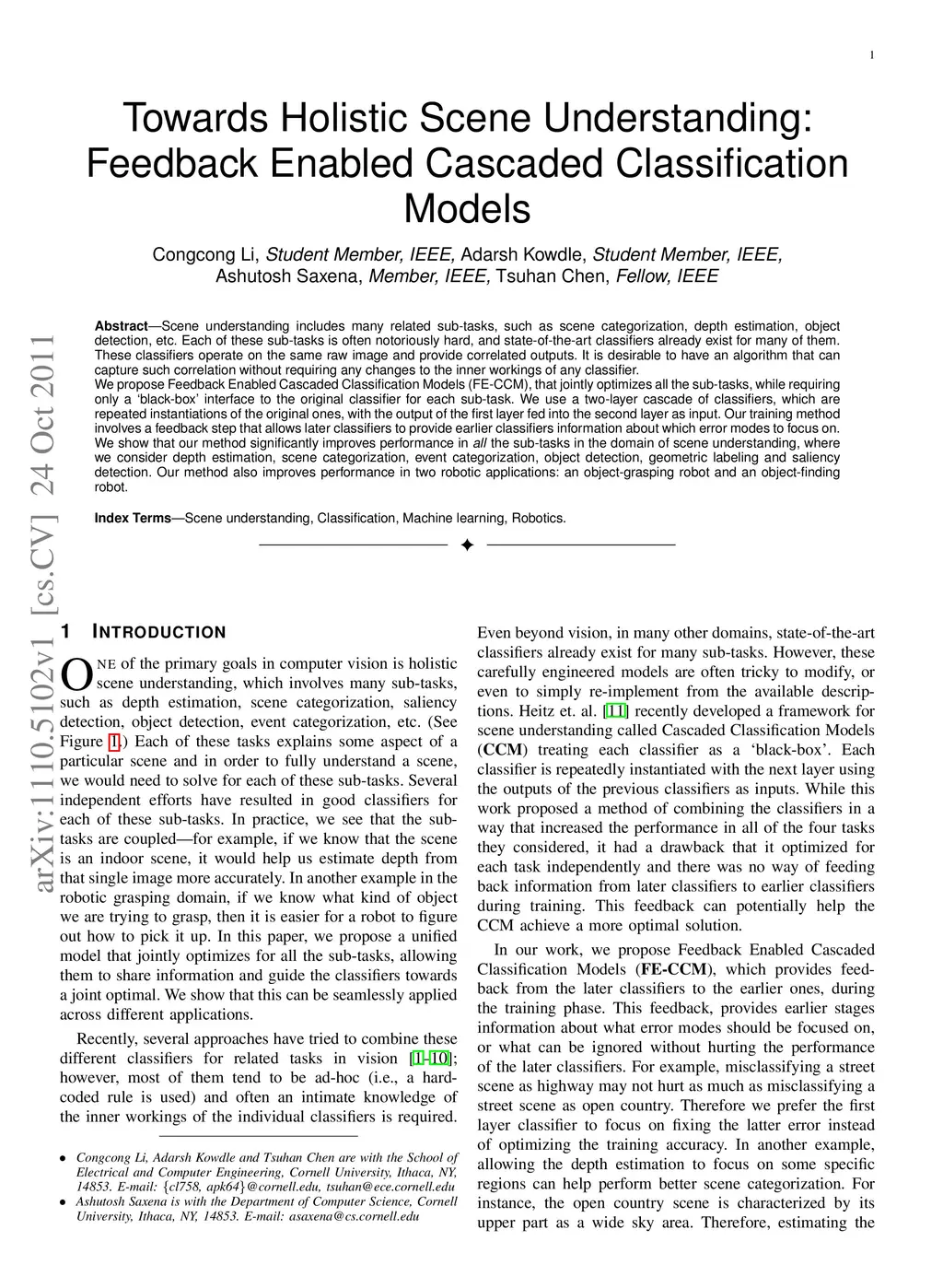 Scene understanding includes many related sub-tasks, such as scene categorization, depth estimation, object detection, etc. Each of these sub-tasks is often notoriously hard, and state-of-the-art classifiers already exist for many of them. These classifiers operate on the same raw image and provide correlated outputs. It is desirable to have an algorithm that can capture such correlation without requiring any changes to the inner workings of any classifier. We propose Feedback Enabled Cascaded Classification Models (FE-CCM), that jointly optimizes all the sub-tasks, while requiring only a `black-box' interface to the original classifier for each sub-task. We use a two-layer cascade of classifiers, which are repeated instantiations of the original ones, with the output of the first layer fed into the second layer as input. Our training method involves a feedback step that allows later classifiers to provide earlier classifiers information about which error modes to focus on. We show that our method significantly improves performance in all the sub-tasks in the domain of scene understanding, where we consider depth estimation, scene categorization, event categorization, object detection, geometric labeling and saliency detection. Our method also improves performance in two robotic applications: an object-grasping robot and an object-finding robot.