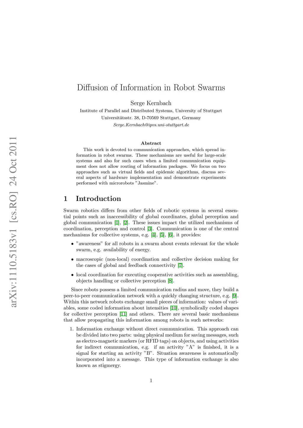 This work is devoted to communication approaches, which spread information in robot swarms. These mechanisms are useful for large-scale systems and also for such cases when a limited communication equipment does not allow routing of information packages. We focus on two approaches such as virtual fields and epidemic algorithms, discuss several aspects of hardware implementation and demonstrate experiments performed with microrobots "Jasmine".
