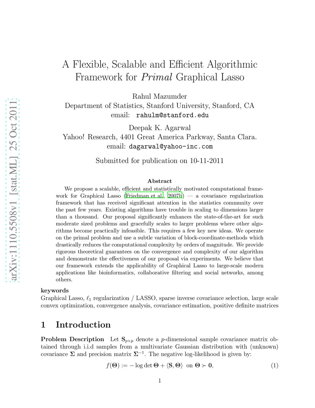We propose a scalable, efficient and statistically motivated computational framework for Graphical Lasso (Friedman et al., 2007b) - a covariance regularization framework that has received significant attention in the statistics community over the past few years. Existing algorithms have trouble in scaling to dimensions larger than a thousand. Our proposal significantly enhances the state-of-the-art for such moderate sized problems and gracefully scales to larger problems where other algorithms become practically infeasible. This requires a few key new ideas. We operate on the primal problem and use a subtle variation of block-coordinate-methods which drastically reduces the computational complexity by orders of magnitude. We provide rigorous theoretical guarantees on the convergence and complexity of our algorithm and demonstrate the effectiveness of our proposal via experiments. We believe that our framework extends the applicability of Graphical Lasso to large-scale modern applications like bioinformatics, collaborative filtering and social networks, among others.