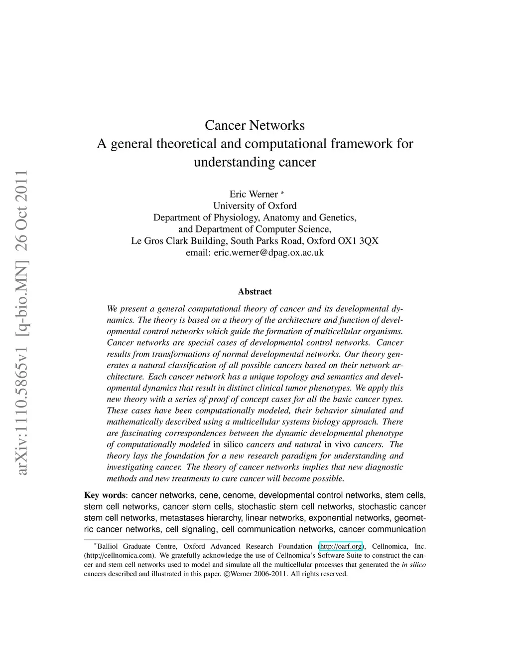 We present a general computational theory of cancer and its developmental dynamics. The theory is based on a theory of the architecture and function of developmental control networks which guide the formation of multicellular organisms. Cancer networks are special cases of developmental control networks. Cancer results from transformations of normal developmental networks. Our theory generates a natural classification of all possible cancers based on their network architecture. Each cancer network has a unique topology and semantics and developmental dynamics that result in distinct clinical tumor phenotypes. We apply this new theory with a series of proof of concept cases for all the basic cancer types. These cases have been computationally modeled, their behavior simulated and mathematically described using a multicellular systems biology approach. There are fascinating correspondences between the dynamic developmental phenotype of computationally modeled {\em in silico} cancers and natural {\em in vivo} cancers. The theory lays the foundation for a new research paradigm for understanding and investigating cancer. The theory of cancer networks implies that new diagnostic methods and new treatments to cure cancer will become possible.