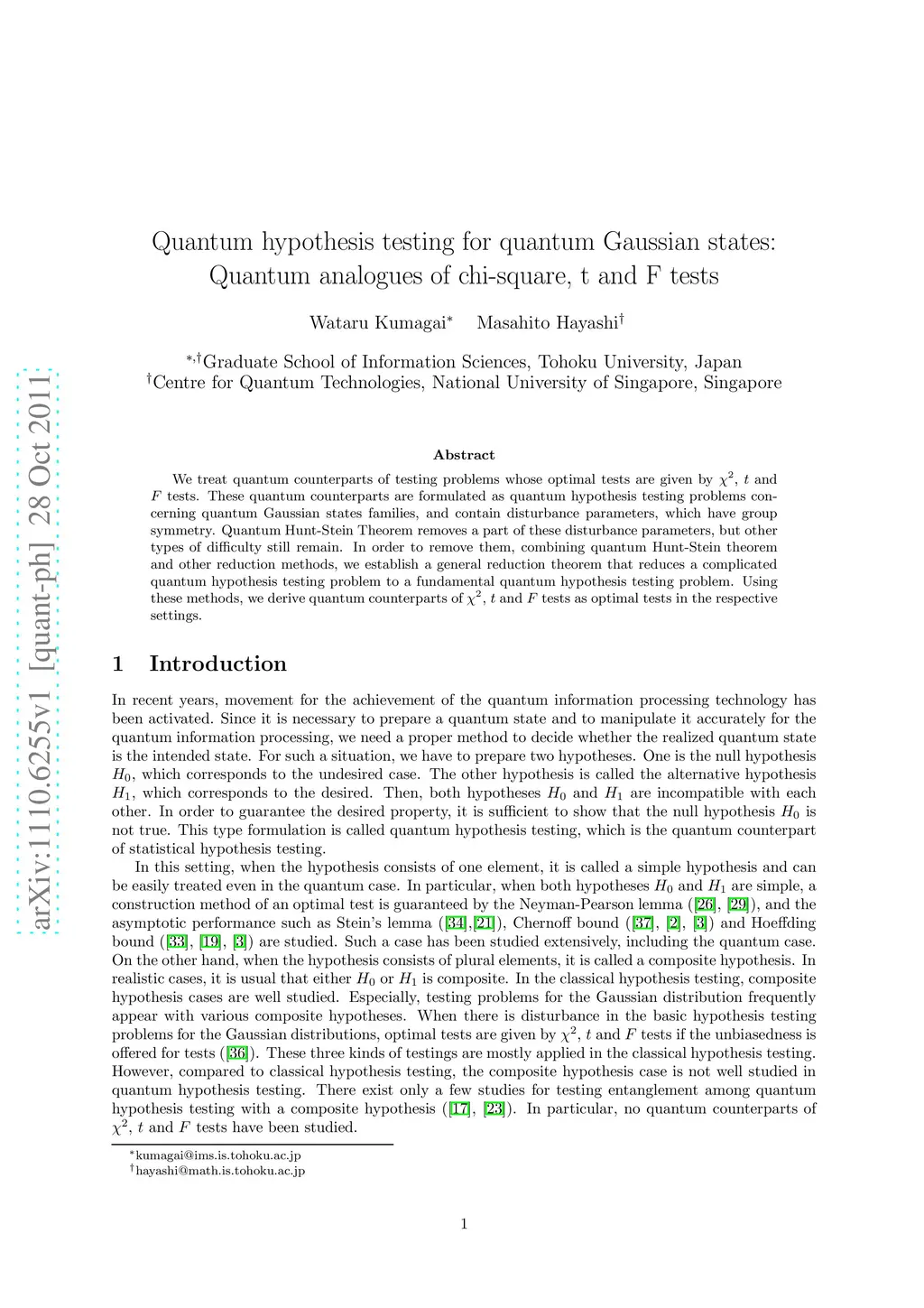 We treat quantum counterparts of testing problems whose optimal tests are given by chi-square, t and F tests. These quantum counterparts are formulated as quantum hypothesis testing problems concerning quantum Gaussian states families, and contain disturbance parameters, which have group symmetry. Quantum Hunt-Stein Theorem removes a part of these disturbance parameters, but other types of difficulty still remain. In order to remove them, combining quantum Hunt-Stein theorem and other reduction methods, we establish a general reduction theorem that reduces a complicated quantum hypothesis testing problem to a fundamental quantum hypothesis testing problem. Using these methods, we derive quantum counterparts of chi-square, t and F tests as optimal tests in the respective settings.