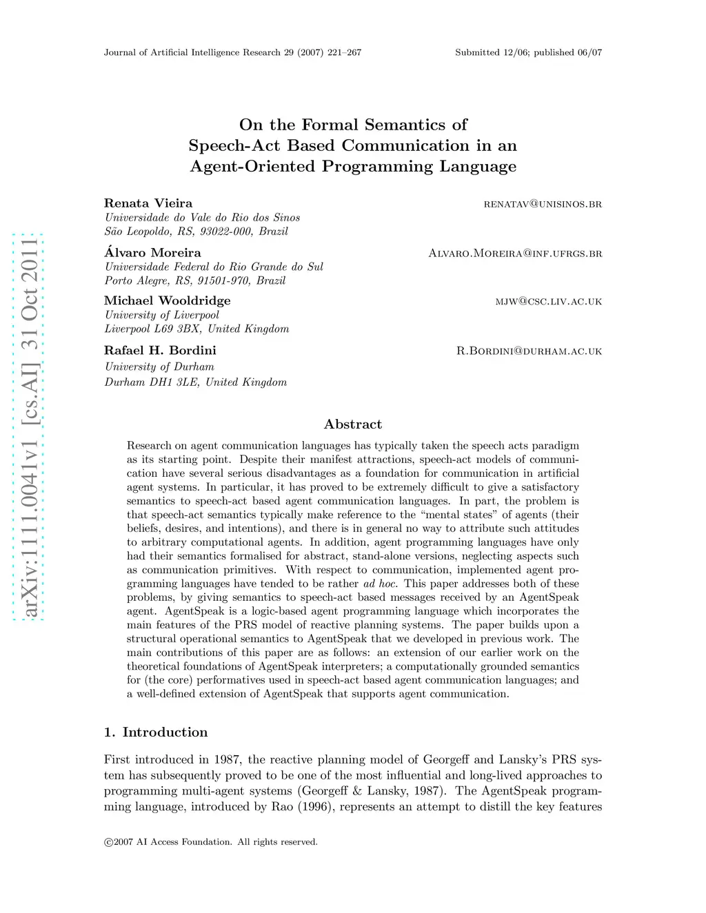 Research on agent communication languages has typically taken the speech acts paradigm as its starting point. Despite their manifest attractions, speech-act models of communication have several serious disadvantages as a foundation for communication in artificial agent systems. In particular, it has proved to be extremely difficult to give a satisfactory semantics to speech-act based agent communication languages. In part, the problem is that speech-act semantics typically make reference to the "mental states" of agents (their beliefs, desires, and intentions), and there is in general no way to attribute such attitudes to arbitrary computational agents. In addition, agent programming languages have only had their semantics formalised for abstract, stand-alone versions, neglecting aspects such as communication primitives. With respect to communication, implemented agent programming languages have tended to be rather ad hoc. This paper addresses both of these problems, by giving semantics to speech-act based messages received by an AgentSpeak agent. AgentSpeak is a logic-based agent programming language which incorporates the main features of the PRS model of reactive planning systems. The paper builds upon a structural operational semantics to AgentSpeak that we developed in previous work. The main contributions of this paper are as follows: an extension of our earlier work on the theoretical foundations of AgentSpeak interpreters; a computationally grounded semantics for (the core) performatives used in speech-act based agent communication languages; and a well-defined extension of AgentSpeak that supports agent communication.