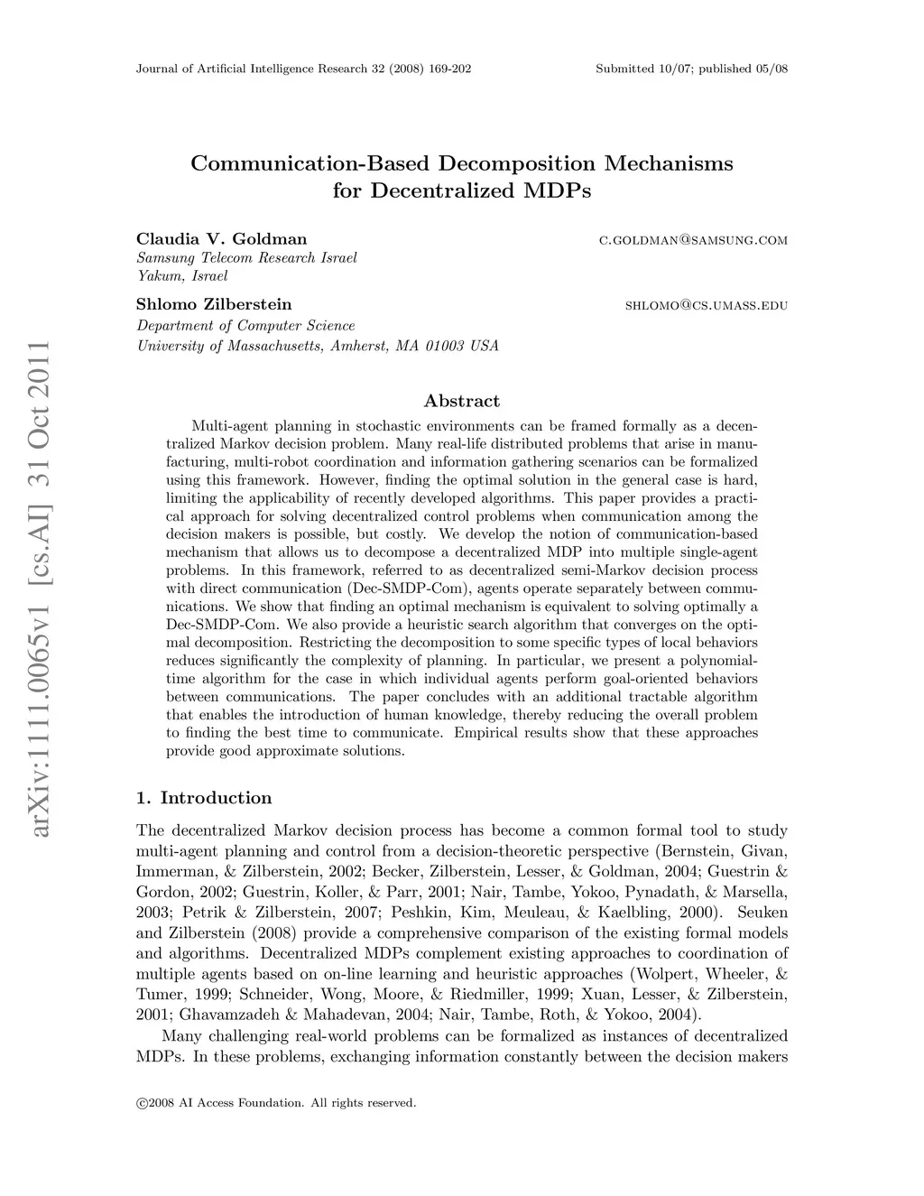 Communication-Based Decomposition Mechanisms for Decentralized MDPs
