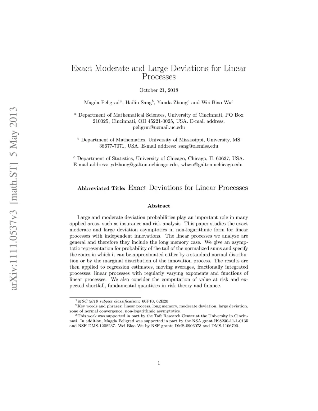 Large and moderate deviation probabilities play an important role in many applied areas, such as insurance and risk analysis. This paper studies the exact moderate and large deviation asymptotics in non-logarithmic form for linear processes with independent innovations. The linear processes we analyze are general and therefore they include the long memory case. We give an asymptotic representation for probability of the tail of the normalized sums and specify the zones in which it can be approximated either by a standard normal distribution or by the marginal distribution of the innovation process. The results are then applied to regression estimates, moving averages, fractionally integrated processes, linear processes with regularly varying exponents and functions of linear processes. We also consider the computation of value at risk and expected shortfall, fundamental quantities in risk theory and finance.