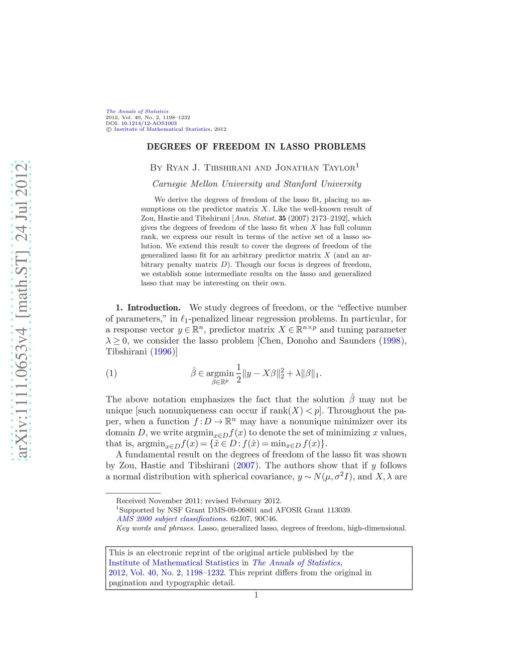 We derive the degrees of freedom of the lasso fit, placing no assumptions on the predictor matrix . Like the well-known result of Zou, Hastie and Tibshirani [Ann. Statist. 35 (2007) 2173-2192], which gives the degrees of freedom of the lasso fit when has full column rank, we express our result in terms of the active set of a lasso solution. We extend this result to cover the degrees of freedom of the generalized lasso fit for an arbitrary predictor matrix (and an arbitrary penalty matrix ). Though our focus is degrees of freedom, we establish some intermediate results on the lasso and generalized lasso that may be interesting on their own.
