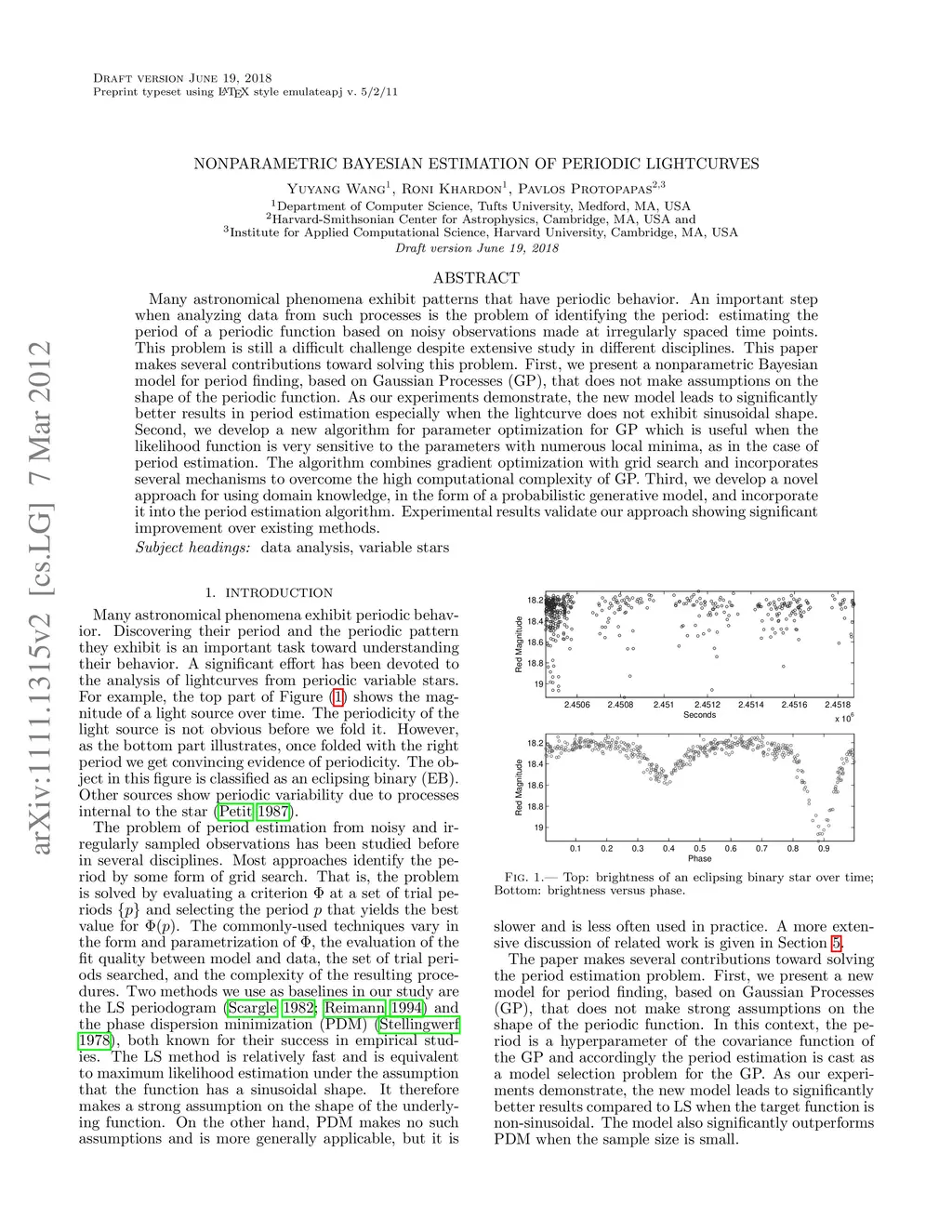 Many real world problems exhibit patterns that have periodic behavior. For example, in astrophysics, periodic variable stars play a pivotal role in understanding our universe. An important step when analyzing data from such processes is the problem of identifying the period: estimating the period of a periodic function based on noisy observations made at irregularly spaced time points. This problem is still a difficult challenge despite extensive study in different disciplines. The paper makes several contributions toward solving this problem. First, we present a nonparametric Bayesian model for period finding, based on Gaussian Processes (GP), that does not make strong assumptions on the shape of the periodic function. As our experiments demonstrate, the new model leads to significantly better results in period estimation when the target function is non-sinusoidal. Second, we develop a new algorithm for parameter optimization for GP which is useful when the likelihood function is very sensitive to the setting of the hyper-parameters with numerous local minima, as in the case of period estimation. The algorithm combines gradient optimization with grid search and incorporates several mechanisms to overcome the high complexity of inference with GP. Third, we develop a novel approach for using domain knowledge, in the form of a probabilistic generative model, and incorporate it into the period estimation algorithm. Experimental results on astrophysics data validate our approach showing significant improvement over the state of the art in this domain.