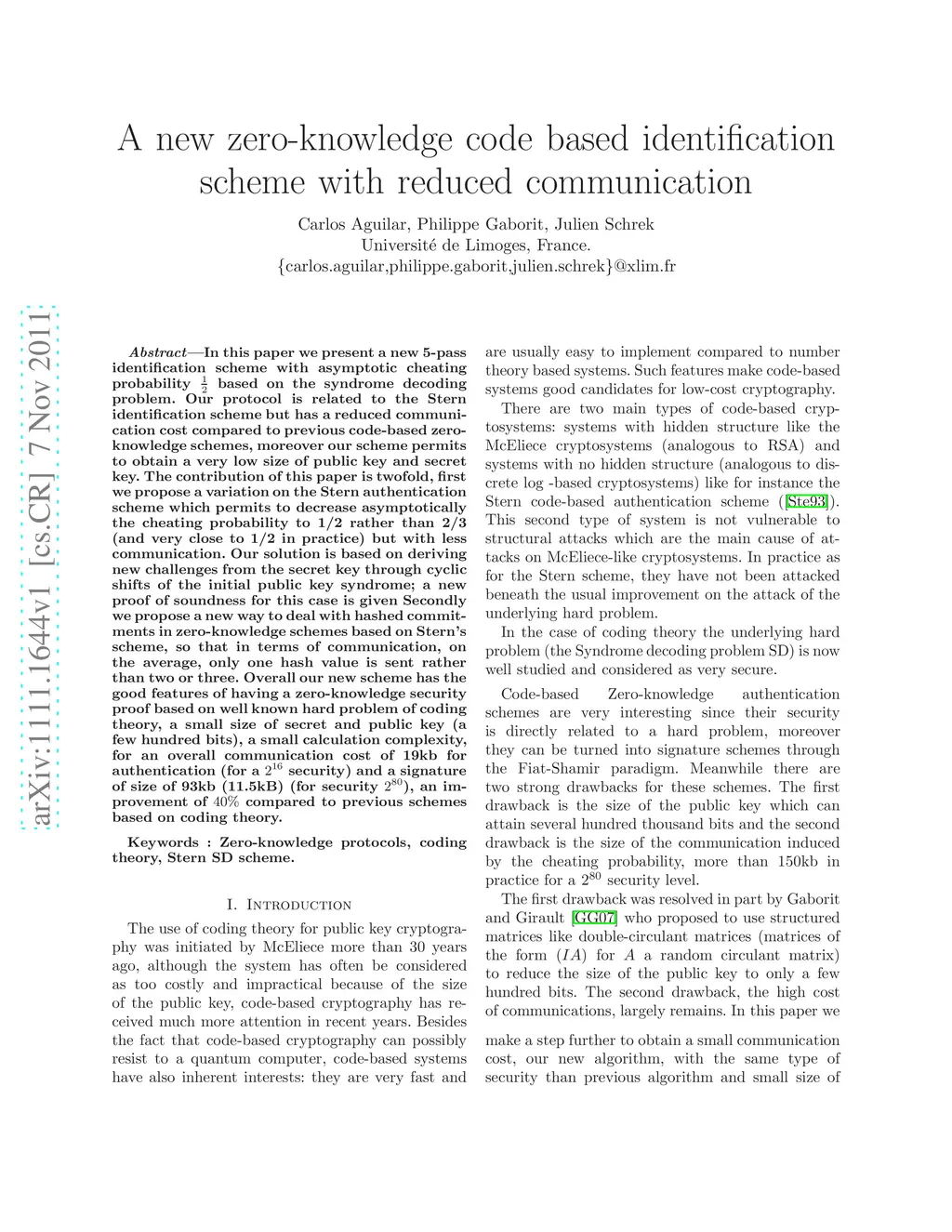 In this paper we present a new 5-pass identification scheme with asymptotic cheating probability 1/2 based on the syndrome decoding problem. Our protocol is related to the Stern identification scheme but has a reduced communication cost compared to previous code-based zero-knowledge schemes, moreover our scheme permits to obtain a very low size of public key and secret key. The contribution of this paper is twofold, first we propose a variation on the Stern authentication scheme which permits to decrease asymptotically the cheating probability to 1/2 rather than 2/3 (and very close to 1/2 in practice) but with less communication. Our solution is based on deriving new challenges from the secret key through cyclic shifts of the initial public key syndrome; a new proof of soundness for this case is given Secondly we propose a new way to deal with hashed commitments in zero-knowledge schemes based on Stern's scheme, so that in terms of communication, on the average, only one hash value is sent rather than two or three. Overall our new scheme has the good features of having a zero-knowledge security proof based on well known hard problem of coding theory, a small size of secret and public key (a few hundred bits), a small calculation complexity, for an overall communication cost of 19kb for authentication (for a security) and a signature of size of 93kb (11.5kB) (for security ), an improvement of 40% compared to previous schemes based on coding theory.