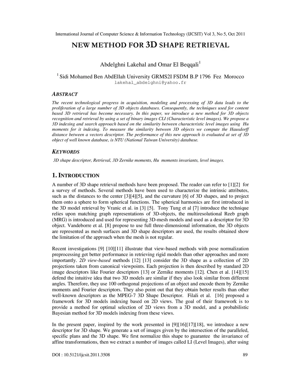 The recent technological progress in acquisition, modeling and processing of 3D data leads to the proliferation of a large number of 3D objects databases. Consequently, the techniques used for content based 3D retrieval has become necessary. In this paper, we introduce a new method for 3D objects recognition and retrieval by using a set of binary images CLI (Characteristic level images). We propose a 3D indexing and search approach based on the similarity between characteristic level images using Hu moments for it indexing. To measure the similarity between 3D objects we compute the Hausdorff distance between a vectors descriptor. The performance of this new approach is evaluated at set of 3D object of well known database, is NTU (National Taiwan University) database.