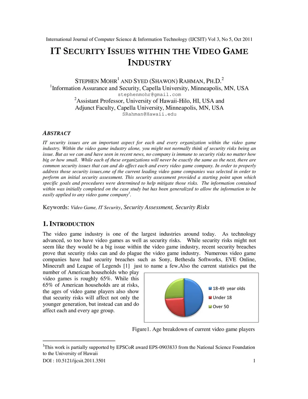 IT security issues are an important aspect for each and every organization within the video game industry. Within the video game industry alone, you might not normally think of security risks being an issue. But as we can and have seen in recent news, no company is immune to security risks no matter how big or how small. While each of these organizations will never be exactly the same as the next, there are common security issues that can and do affect each and every video game company. In order to properly address those security issues, one of the current leading video game companies was selected in order to perform an initial security assessment. This security assessment provided a starting point upon which specific goals and procedures were determined to help mitigate those risks. The information contained within was initially completed on the case study but has been generalized to allow the information to be easily applied to any video game company.