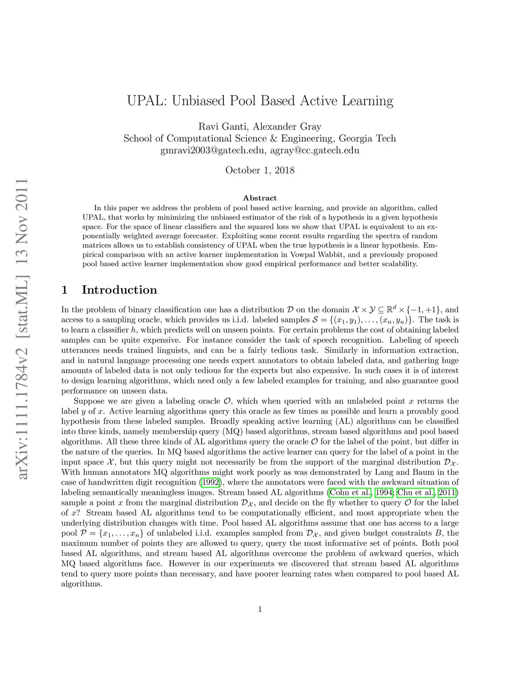 In this paper we address the problem of pool based active learning, and provide an algorithm, called UPAL, that works by minimizing the unbiased estimator of the risk of a hypothesis in a given hypothesis space. For the space of linear classifiers and the squared loss we show that UPAL is equivalent to an exponentially weighted average forecaster. Exploiting some recent results regarding the spectra of random matrices allows us to establish consistency of UPAL when the true hypothesis is a linear hypothesis. Empirical comparison with an active learner implementation in Vowpal Wabbit, and a previously proposed pool based active learner implementation show good empirical performance and better scalability.