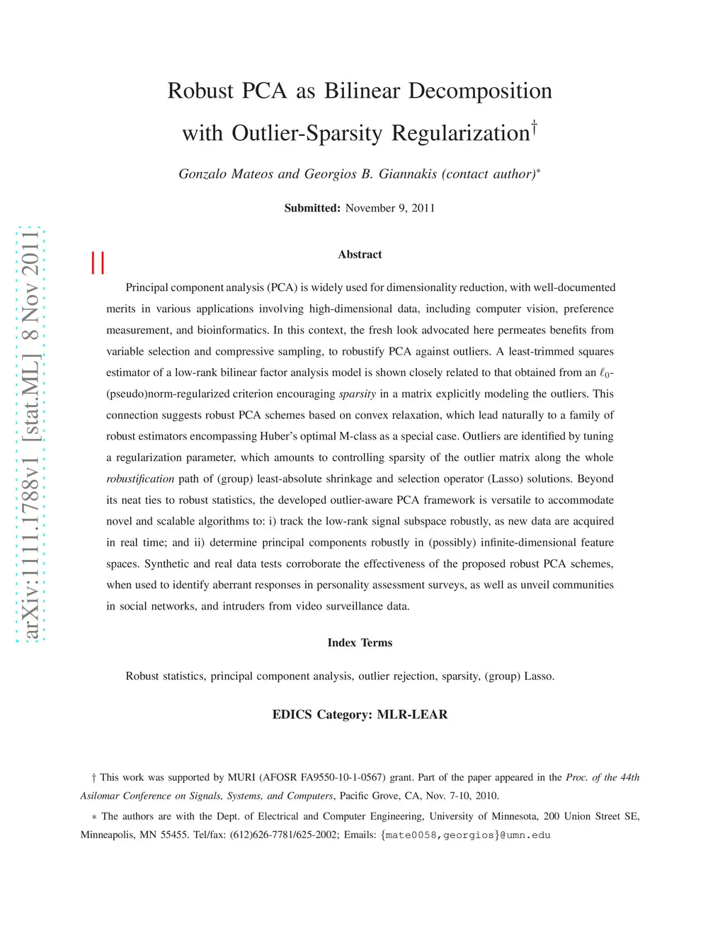 Principal component analysis (PCA) is widely used for dimensionality reduction, with well-documented merits in various applications involving high-dimensional data, including computer vision, preference measurement, and bioinformatics. In this context, the fresh look advocated here permeates benefits from variable selection and compressive sampling, to robustify PCA against outliers. A least-trimmed squares estimator of a low-rank bilinear factor analysis model is shown closely related to that obtained from an -(pseudo)norm-regularized criterion encouraging sparsity in a matrix explicitly modeling the outliers. This connection suggests robust PCA schemes based on convex relaxation, which lead naturally to a family of robust estimators encompassing Huber's optimal M-class as a special case. Outliers are identified by tuning a regularization parameter, which amounts to controlling sparsity of the outlier matrix along the whole robustification path of (group) least-absolute shrinkage and selection operator (Lasso) solutions. Beyond its neat ties to robust statistics, the developed outlier-aware PCA framework is versatile to accommodate novel and scalable algorithms to: i) track the low-rank signal subspace robustly, as new data are acquired in real time; and ii) determine principal components robustly in (possibly) infinite-dimensional feature spaces. Synthetic and real data tests corroborate the effectiveness of the proposed robust PCA schemes, when used to identify aberrant responses in personality assessment surveys, as well as unveil communities in social networks, and intruders from video surveillance data.