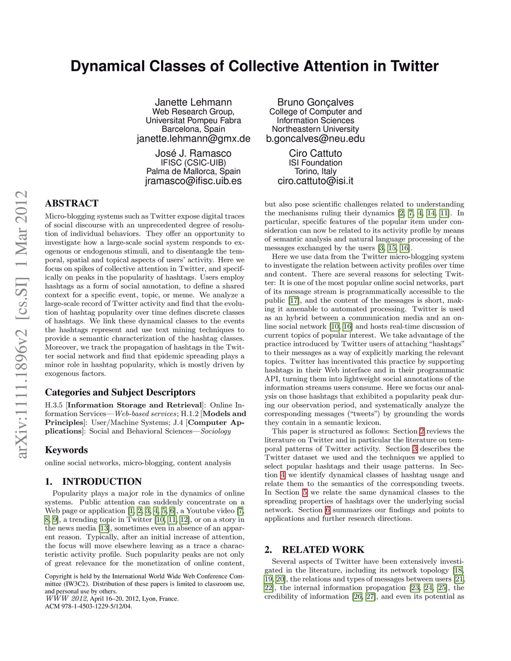 Micro-blogging systems such as Twitter expose digital traces of social discourse with an unprecedented degree of resolution of individual behaviors. They offer an opportunity to investigate how a large-scale social system responds to exogenous or endogenous stimuli, and to disentangle the temporal, spatial and topical aspects of users' activity. Here we focus on spikes of collective attention in Twitter, and specifically on peaks in the popularity of hashtags. Users employ hashtags as a form of social annotation, to define a shared context for a specific event, topic, or meme. We analyze a large-scale record of Twitter activity and find that the evolution of hastag popularity over time defines discrete classes of hashtags. We link these dynamical classes to the events the hashtags represent and use text mining techniques to provide a semantic characterization of the hastag classes. Moreover, we track the propagation of hashtags in the Twitter social network and find that epidemic spreading plays a minor role in hastag popularity, which is mostly driven by exogenous factors.