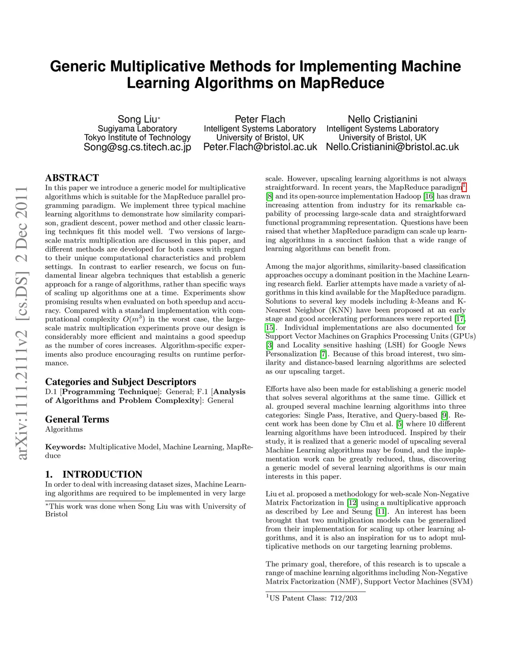 In this paper we introduce a generic model for multiplicative algorithms which is suitable for the MapReduce parallel programming paradigm. We implement three typical machine learning algorithms to demonstrate how similarity comparison, gradient descent, power method and other classic learning techniques fit this model well. Two versions of large-scale matrix multiplication are discussed in this paper, and different methods are developed for both cases with regard to their unique computational characteristics and problem settings. In contrast to earlier research, we focus on fundamental linear algebra techniques that establish a generic approach for a range of algorithms, rather than specific ways of scaling up algorithms one at a time. Experiments show promising results when evaluated on both speedup and accuracy. Compared with a standard implementation with computational complexity in the worst case, the large-scale matrix multiplication experiments prove our design is considerably more efficient and maintains a good speedup as the number of cores increases. Algorithm-specific experiments also produce encouraging results on runtime performance.