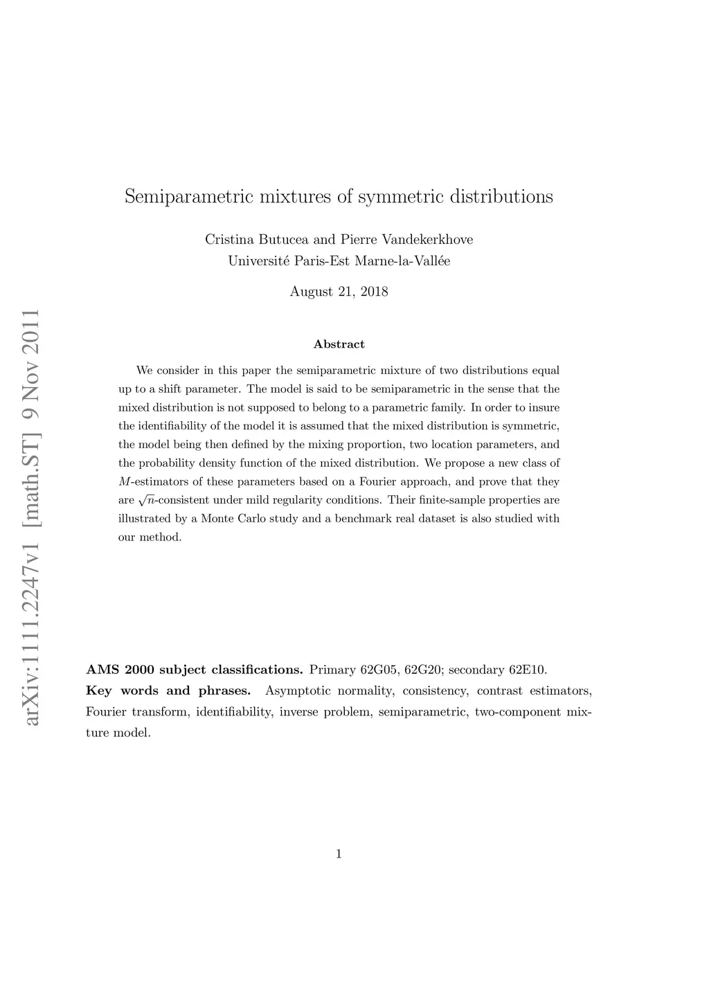 We consider in this paper the semiparametric mixture of two distributions equal up to a shift parameter. The model is said to be semiparametric in the sense that the mixed distribution is not supposed to belong to a parametric family. In order to insure the identifiability of the model it is assumed that the mixed distribution is symmetric, the model being then defined by the mixing proportion, two location parameters, and the probability density function of the mixed distribution. We propose a new class of M-estimators of these parameters based on a Fourier approach, and prove that they are square root consistent under mild regularity conditions. Their finite-sample properties are illustrated by a Monte Carlo study and a benchmark real dataset is also studied with our method.
