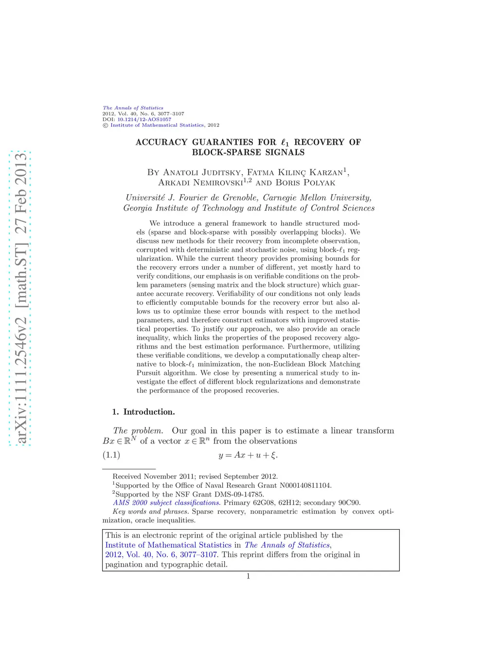 We introduce a general framework to handle structured models (sparse and block-sparse with possibly overlapping blocks). We discuss new methods for their recovery from incomplete observation, corrupted with deterministic and stochastic noise, using block- regularization. While the current theory provides promising bounds for the recovery errors under a number of different, yet mostly hard to verify conditions, our emphasis is on verifiable conditions on the problem parameters (sensing matrix and the block structure) which guarantee accurate recovery. Verifiability of our conditions not only leads to efficiently computable bounds for the recovery error but also allows us to optimize these error bounds with respect to the method parameters, and therefore construct estimators with improved statistical properties. To justify our approach, we also provide an oracle inequality, which links the properties of the proposed recovery algorithms and the best estimation performance. Furthermore, utilizing these verifiable conditions, we develop a computationally cheap alternative to block- minimization, the non-Euclidean Block Matching Pursuit algorithm. We close by presenting a numerical study to investigate the effect of different block regularizations and demonstrate the performance of the proposed recoveries.