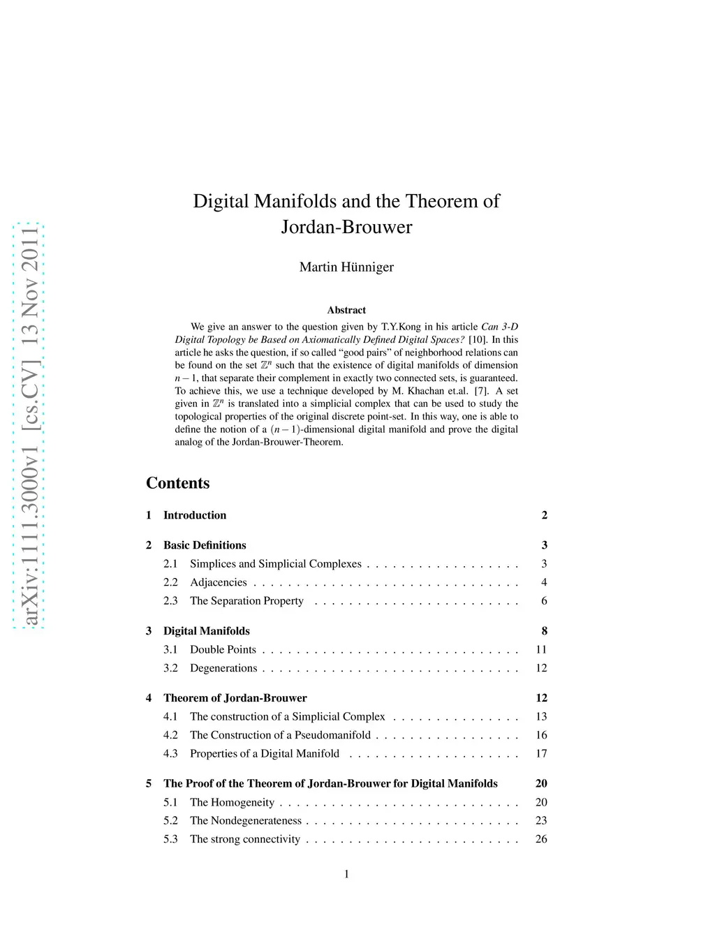 We give an answer to the question given by T.Y.Kong in his article "Can 3-D Digital Topology be Based on Axiomatically Defined Digital Spaces?" In this article he asks the question, if so called "good pairs" of neighborhood relations can be found on the set Z^n such that the existence of digital manifolds of dimension n-1, that separate their complement in exactly two connected sets, is guaranteed. To achieve this, we use a technique developed by M. Khachan et.al. A set given in Z^n is translated into a simplicial complex that can be used to study the topological properties of the original discrete point-set. In this way, one is able to define the notion of a (n-1)-dimensional digital manifold and prove the digital analog of the Jordan-Brouwer-Theorem.