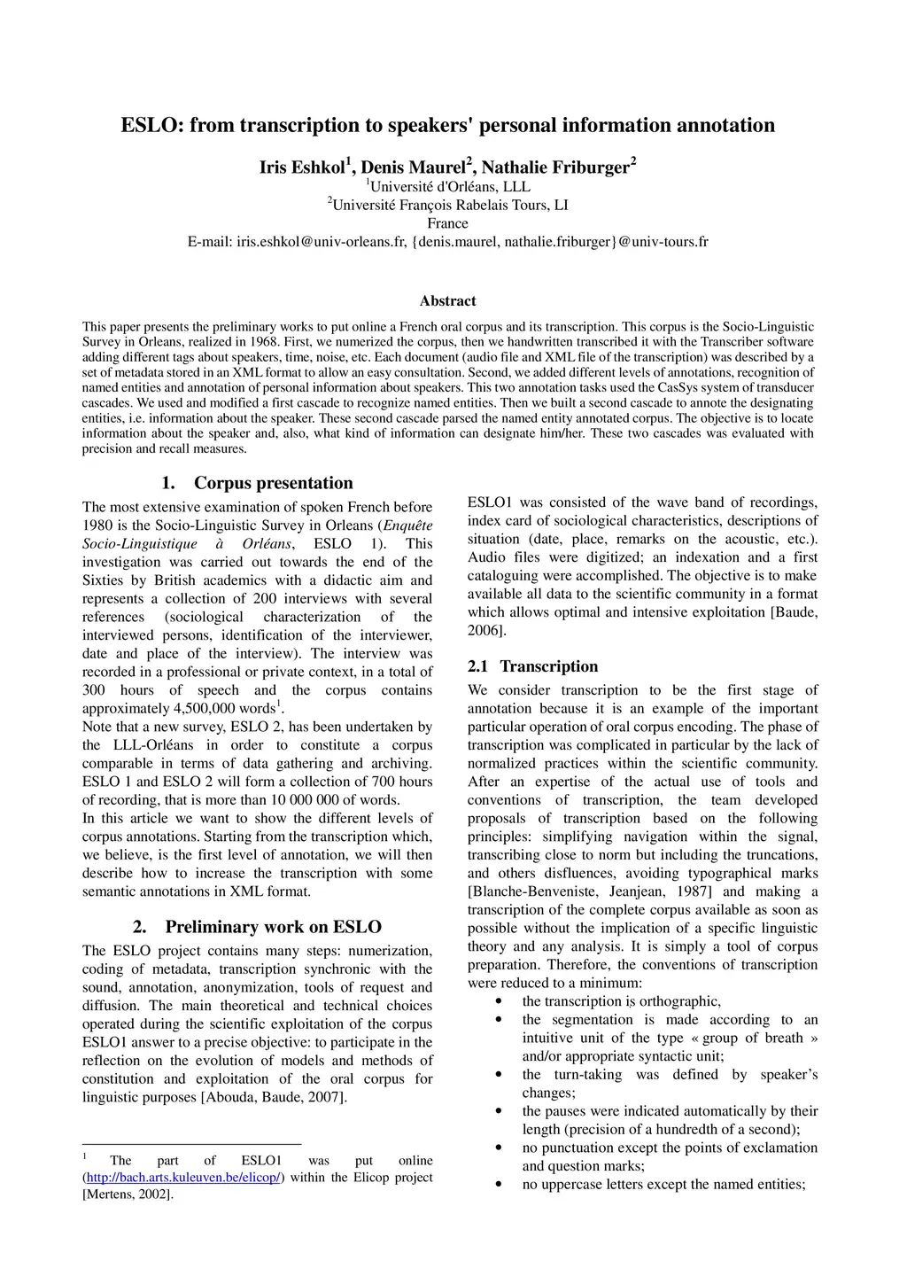 This paper presents the preliminary works to put online a French oral corpus and its transcription. This corpus is the Socio-Linguistic Survey in Orleans, realized in 1968. First, we numerized the corpus, then we handwritten transcribed it with the Transcriber software adding different tags about speakers, time, noise, etc. Each document (audio file and XML file of the transcription) was described by a set of metadata stored in an XML format to allow an easy consultation. Second, we added different levels of annotations, recognition of named entities and annotation of personal information about speakers. This two annotation tasks used the CasSys system of transducer cascades. We used and modified a first cascade to recognize named entities. Then we built a second cascade to annote the designating entities, i.e. information about the speaker. These second cascade parsed the named entity annotated corpus. The objective is to locate information about the speaker and, also, what kind of information can designate him/her. These two cascades was evaluated with precision and recall measures.