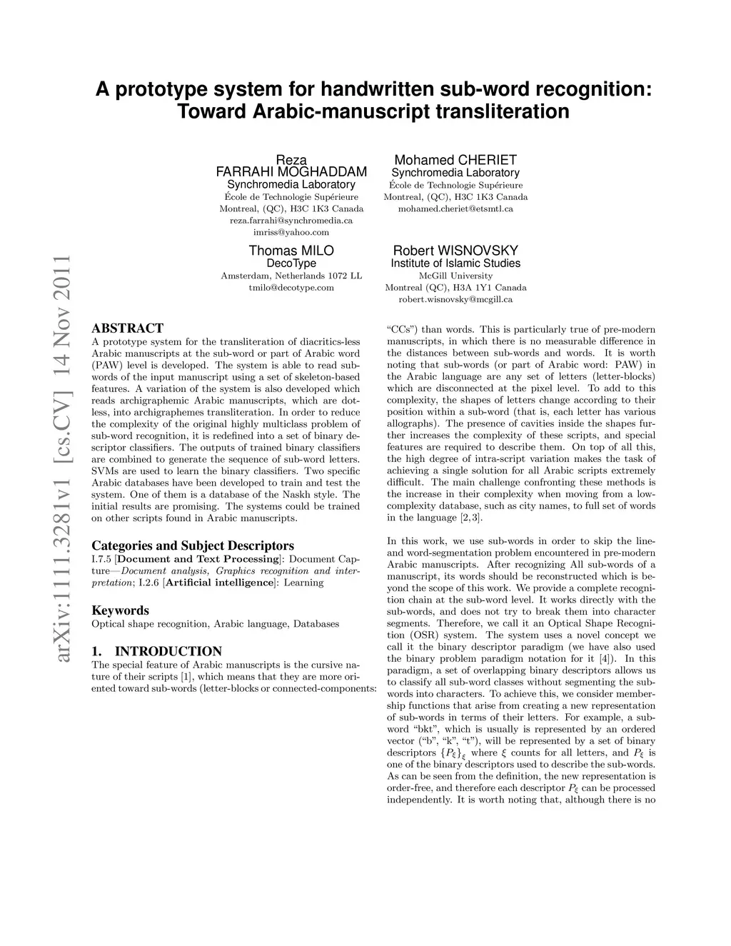 A prototype system for the transliteration of diacritics-less Arabic manuscripts at the sub-word or part of Arabic word (PAW) level is developed. The system is able to read sub-words of the input manuscript using a set of skeleton-based features. A variation of the system is also developed which reads archigraphemic Arabic manuscripts, which are dot-less, into archigraphemes transliteration. In order to reduce the complexity of the original highly multiclass problem of sub-word recognition, it is redefined into a set of binary descriptor classifiers. The outputs of trained binary classifiers are combined to generate the sequence of sub-word letters. SVMs are used to learn the binary classifiers. Two specific Arabic databases have been developed to train and test the system. One of them is a database of the Naskh style. The initial results are promising. The systems could be trained on other scripts found in Arabic manuscripts.