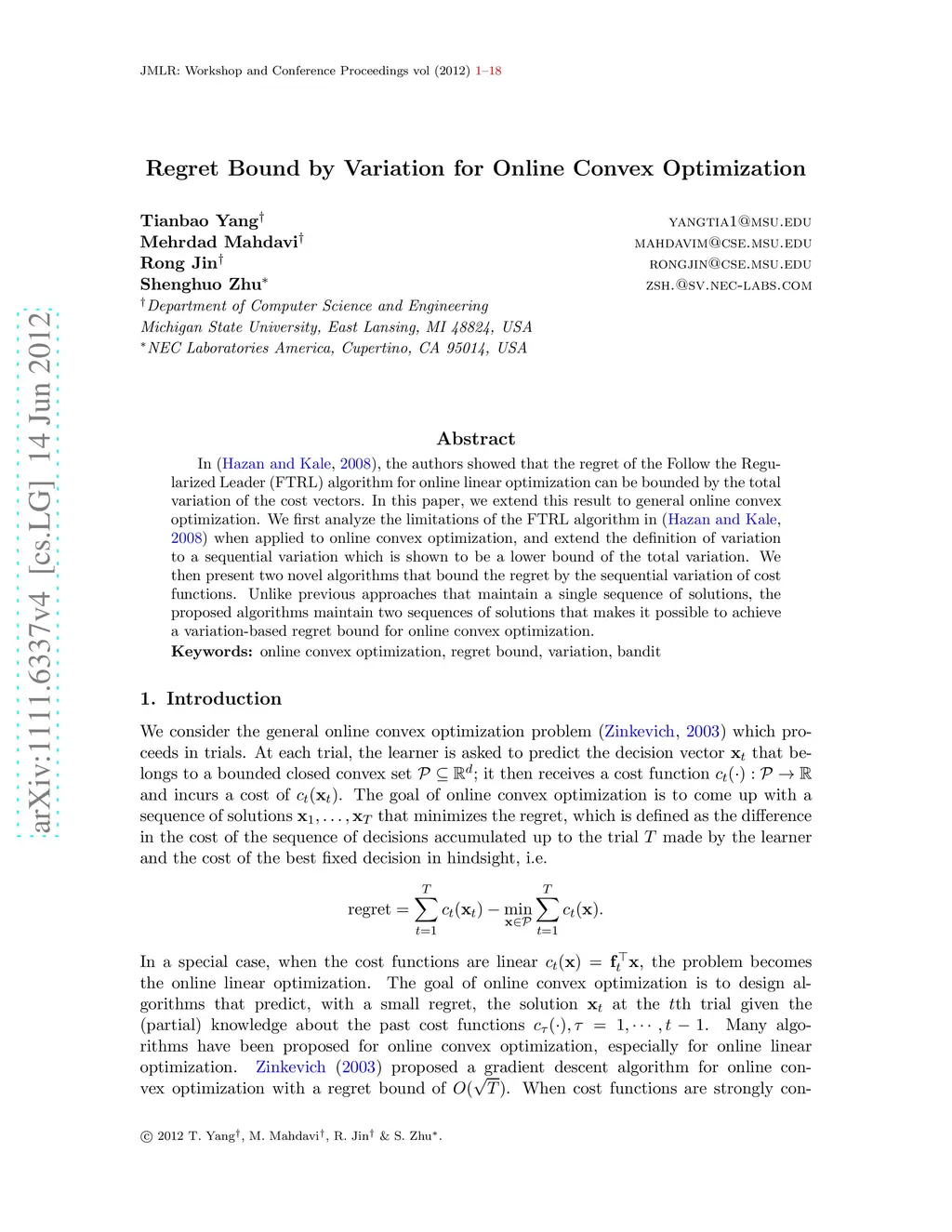 In citep{Hazan-2008-extract}, the authors showed that the regret of online linear optimization can be bounded by the total variation of the cost vectors. In this paper, we extend this result to general online convex optimization. We first analyze the limitations of the algorithm in \citep{Hazan-2008-extract} when applied it to online convex optimization. We then present two algorithms for online convex optimization whose regrets are bounded by the variation of cost functions. We finally consider the bandit setting, and present a randomized algorithm for online bandit convex optimization with a variation-based regret bound. We show that the regret bound for online bandit convex optimization is optimal when the variation of cost functions is independent of the number of trials.