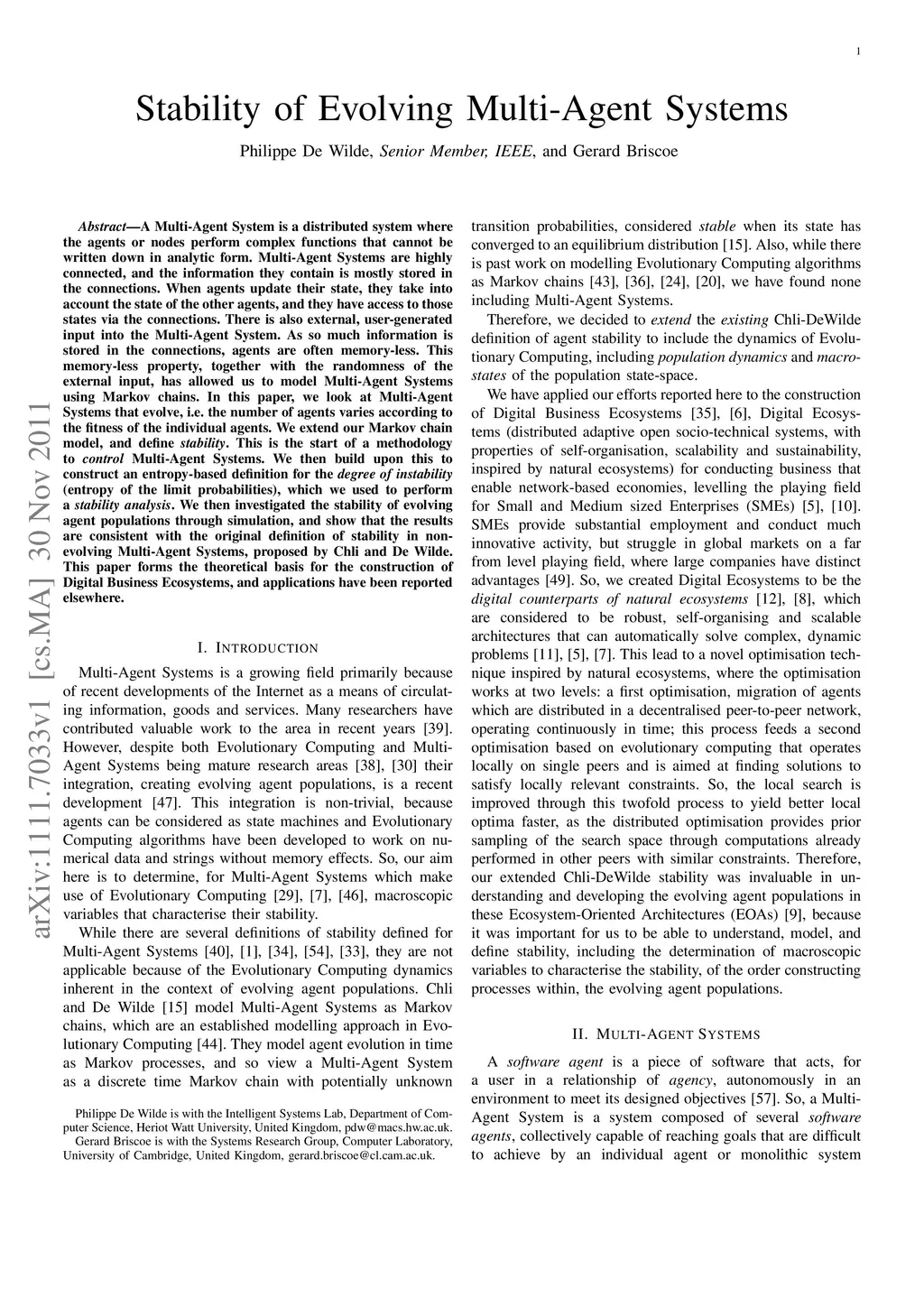 A Multi-Agent System is a distributed system where the agents or nodes perform complex functions that cannot be written down in analytic form. Multi-Agent Systems are highly connected, and the information they contain is mostly stored in the connections. When agents update their state, they take into account the state of the other agents, and they have access to those states via the connections. There is also external, user-generated input into the Multi-Agent System. As so much information is stored in the connections, agents are often memory-less. This memory-less property, together with the randomness of the external input, has allowed us to model Multi-Agent Systems using Markov chains. In this paper, we look at Multi-Agent Systems that evolve, i.e. the number of agents varies according to the fitness of the individual agents. We extend our Markov chain model, and define stability. This is the start of a methodology to control Multi-Agent Systems. We then build upon this to construct an entropy-based definition for the degree of instability (entropy of the limit probabilities), which we used to perform a stability analysis. We then investigated the stability of evolving agent populations through simulation, and show that the results are consistent with the original definition of stability in non-evolving Multi-Agent Systems, proposed by Chli and De Wilde. This paper forms the theoretical basis for the construction of Digital Business Ecosystems, and applications have been reported elsewhere.