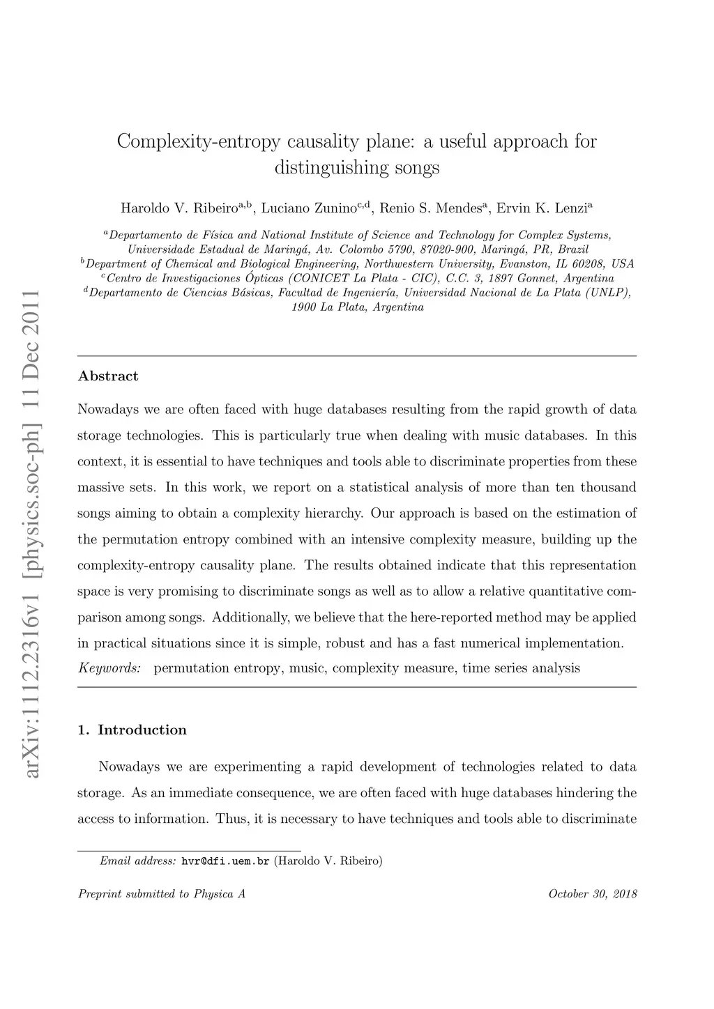 Nowadays we are often faced with huge databases resulting from the rapid growth of data storage technologies. This is particularly true when dealing with music databases. In this context, it is essential to have techniques and tools able to discriminate properties from these massive sets. In this work, we report on a statistical analysis of more than ten thousand songs aiming to obtain a complexity hierarchy. Our approach is based on the estimation of the permutation entropy combined with an intensive complexity measure, building up the complexity-entropy causality plane. The results obtained indicate that this representation space is very promising to discriminate songs as well as to allow a relative quantitative comparison among songs. Additionally, we believe that the here-reported method may be applied in practical situations since it is simple, robust and has a fast numerical implementation.