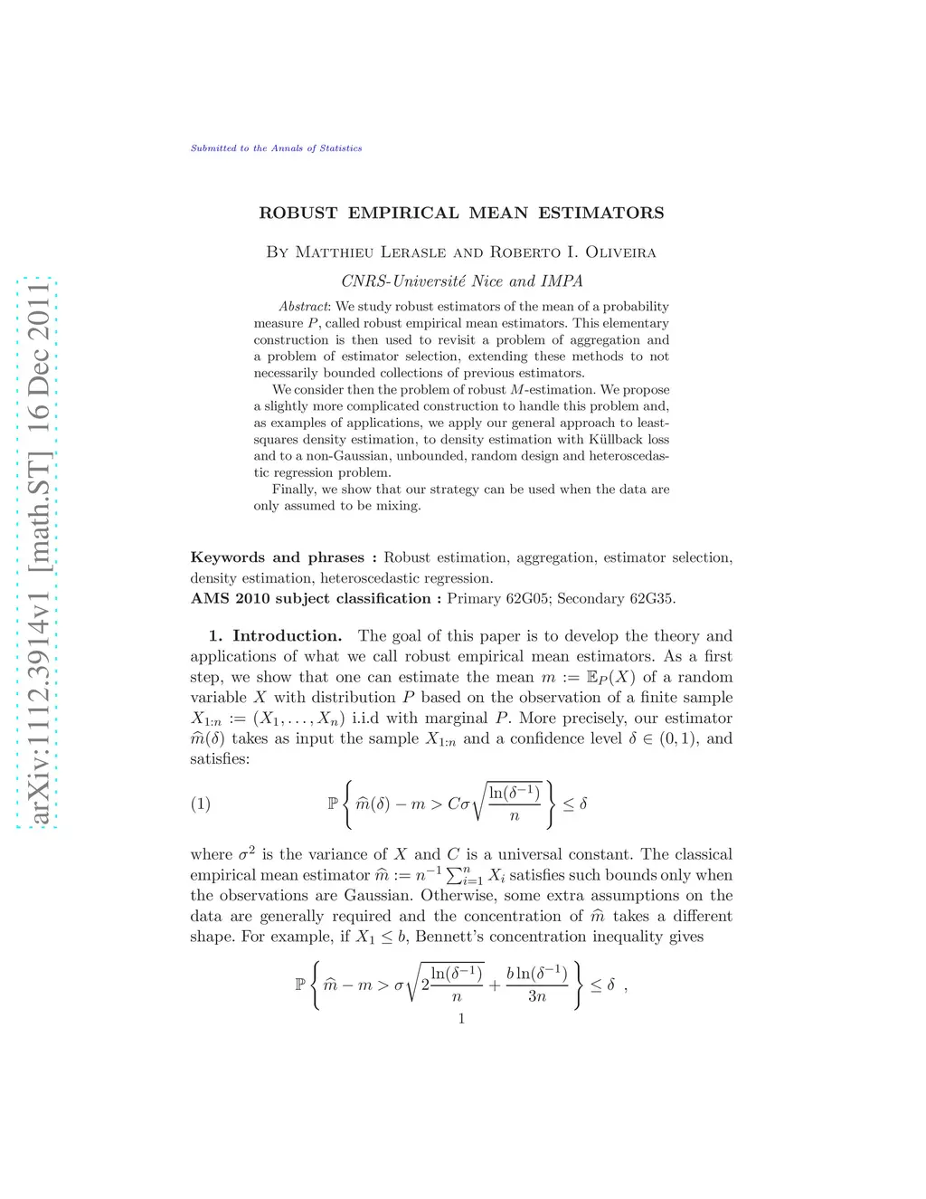 We study robust estimators of the mean of a probability measure , called robust empirical mean estimators. This elementary construction is then used to revisit a problem of aggregation and a problem of estimator selection, extending these methods to not necessarily bounded collections of previous estimators. We consider then the problem of robust -estimation. We propose a slightly more complicated construction to handle this problem and, as examples of applications, we apply our general approach to least-squares density estimation, to density estimation with K\"ullback loss and to a non-Gaussian, unbounded, random design and heteroscedastic regression problem. Finally, we show that our strategy can be used when the data are only assumed to be mixing.