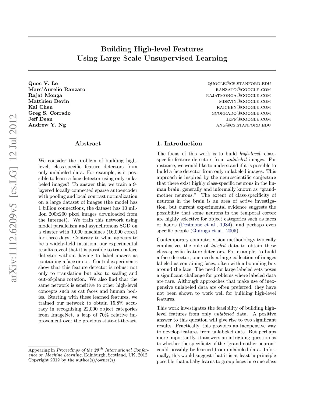 We consider the problem of building high-level, class-specific feature detectors from only unlabeled data. For example, is it possible to learn a face detector using only unlabeled images? To answer this, we train a 9-layered locally connected sparse autoencoder with pooling and local contrast normalization on a large dataset of images (the model has 1 billion connections, the dataset has 10 million 200x200 pixel images downloaded from the Internet). We train this network using model parallelism and asynchronous SGD on a cluster with 1,000 machines (16,000 cores) for three days. Contrary to what appears to be a widely-held intuition, our experimental results reveal that it is possible to train a face detector without having to label images as containing a face or not. Control experiments show that this feature detector is robust not only to translation but also to scaling and out-of-plane rotation. We also find that the same network is sensitive to other high-level concepts such as cat faces and human bodies. Starting with these learned features, we trained our network to obtain 15.8% accuracy in recognizing 20,000 object categories from ImageNet, a leap of 70% relative improvement over the previous state-of-the-art.