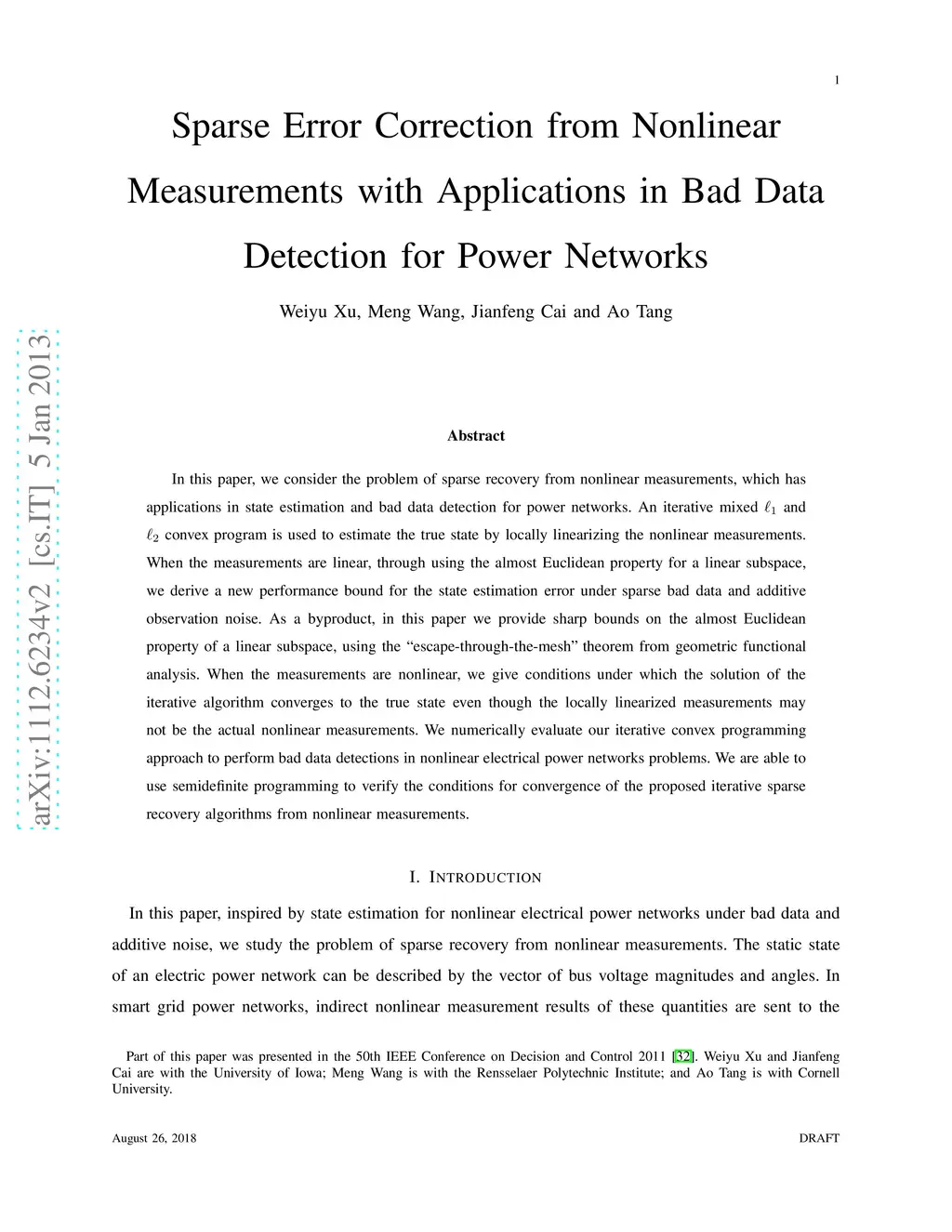 In this paper, we consider the problem of sparse recovery from nonlinear measurements, which has applications in state estimation and bad data detection for power networks. An iterative mixed and convex program is used to estimate the true state by locally linearizing the nonlinear measurements. When the measurements are linear, through using the almost Euclidean property for a linear subspace, we derive a new performance bound for the state estimation error under sparse bad data and additive observation noise. As a byproduct, in this paper we provide sharp bounds on the almost Euclidean property of a linear subspace, using the "escape-through-the-mesh" theorem from geometric functional analysis. When the measurements are nonlinear, we give conditions under which the solution of the iterative algorithm converges to the true state even though the locally linearized measurements may not be the actual nonlinear measurements. We numerically evaluate our iterative convex programming approach to perform bad data detections in nonlinear electrical power networks problems. We are able to use semidefinite programming to verify the conditions for convergence of the proposed iterative sparse recovery algorithms from nonlinear measurements.