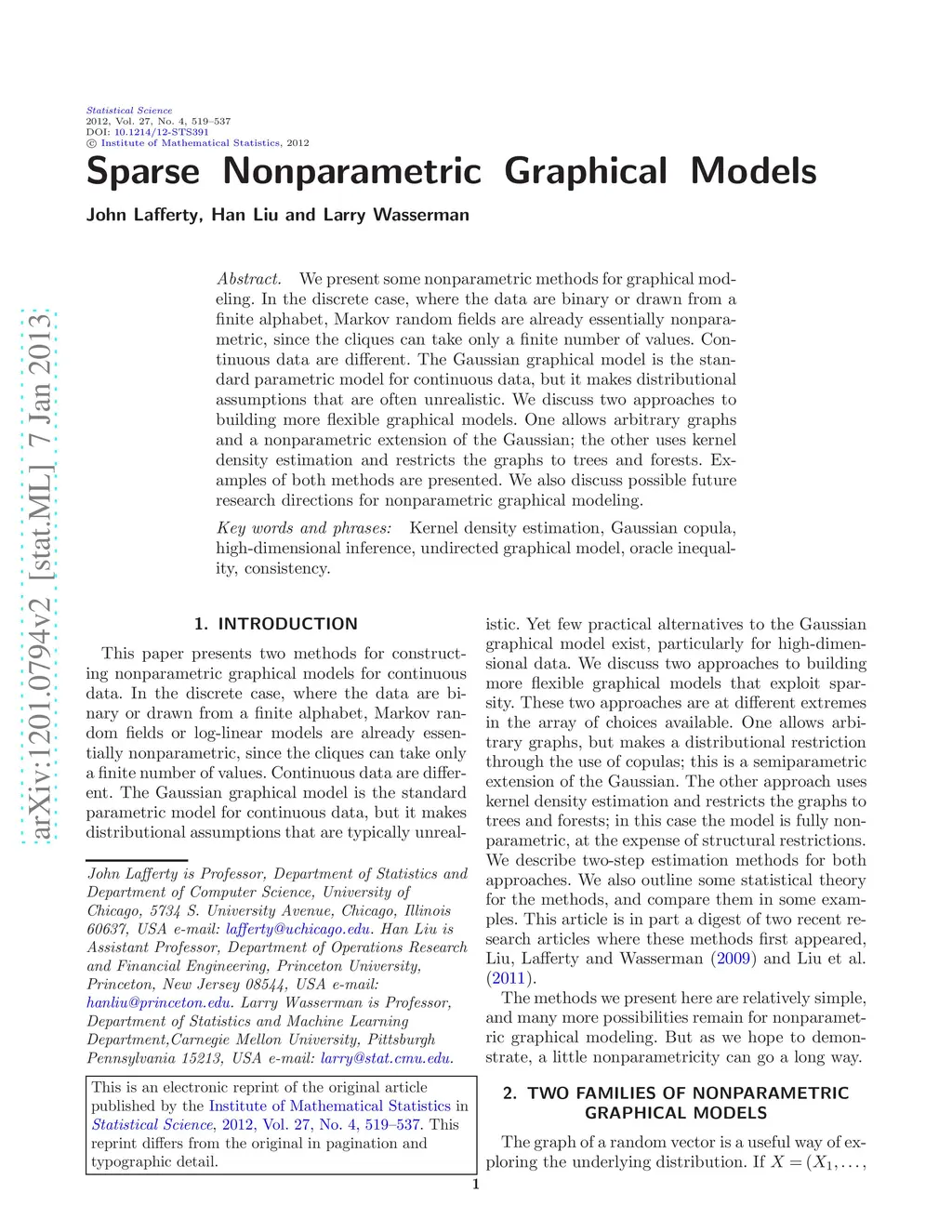 We present some nonparametric methods for graphical modeling. In the discrete case, where the data are binary or drawn from a finite alphabet, Markov random fields are already essentially nonparametric, since the cliques can take only a finite number of values. Continuous data are different. The Gaussian graphical model is the standard parametric model for continuous data, but it makes distributional assumptions that are often unrealistic. We discuss two approaches to building more flexible graphical models. One allows arbitrary graphs and a nonparametric extension of the Gaussian; the other uses kernel density estimation and restricts the graphs to trees and forests. Examples of both methods are presented. We also discuss possible future research directions for nonparametric graphical modeling.