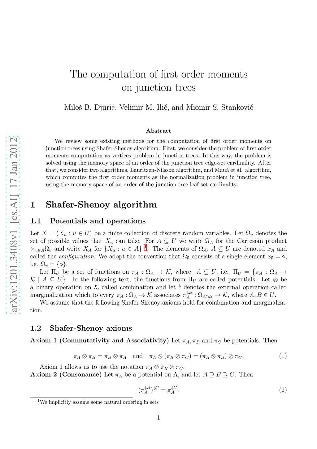 We review some existing methods for the computation of first order moments on junction trees using Shafer-Shenoy algorithm. First, we consider the problem of first order moments computation as vertices problem in junction trees. In this way, the problem is solved using the memory space of an order of the junction tree edge-set cardinality. After that, we consider two algorithms, Lauritzen-Nilsson algorithm, and Mau\á et al. algorithm, which computes the first order moments as the normalization problem in junction tree, using the memory space of an order of the junction tree leaf-set cardinality.