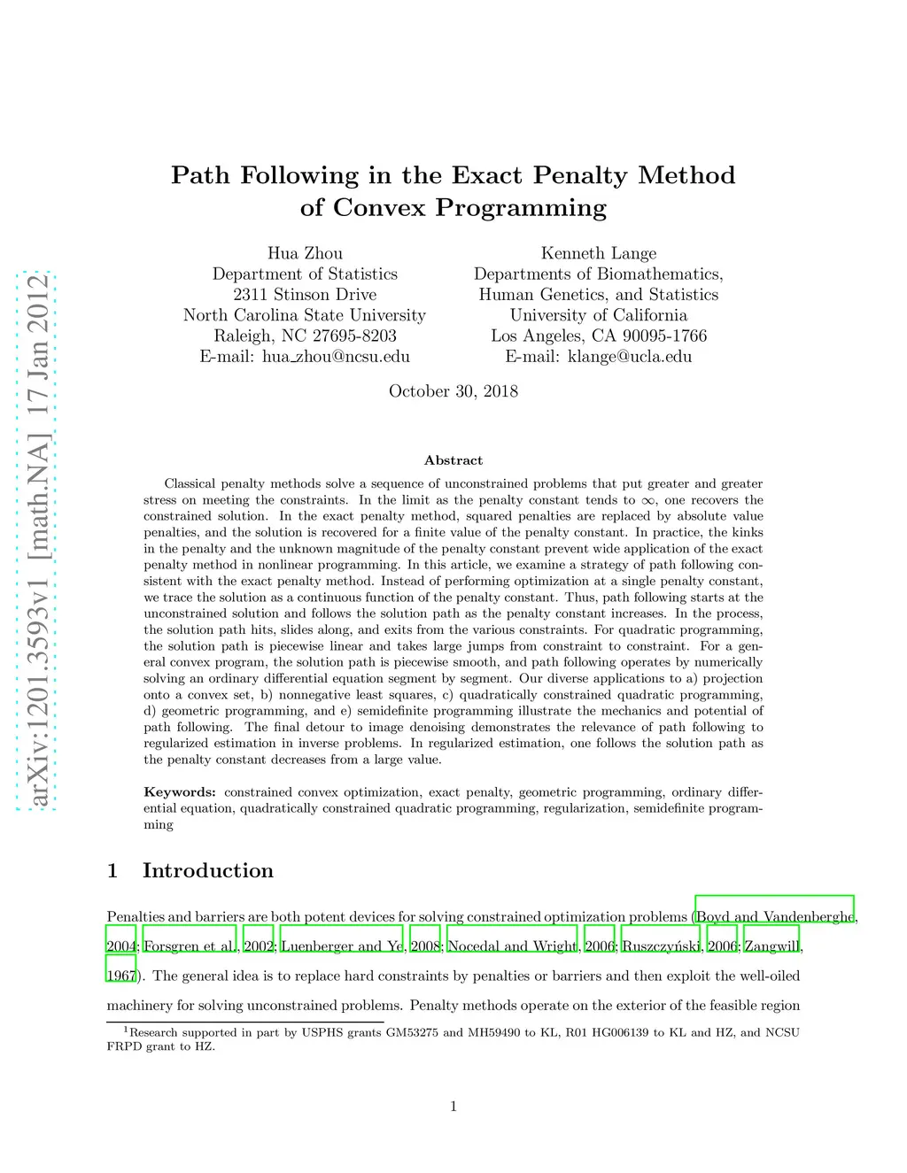 Classical penalty methods solve a sequence of unconstrained problems that put greater and greater stress on meeting the constraints. In the limit as the penalty constant tends to , one recovers the constrained solution. In the exact penalty method, squared penalties are replaced by absolute value penalties, and the solution is recovered for a finite value of the penalty constant. In practice, the kinks in the penalty and the unknown magnitude of the penalty constant prevent wide application of the exact penalty method in nonlinear programming. In this article, we examine a strategy of path following consistent with the exact penalty method. Instead of performing optimization at a single penalty constant, we trace the solution as a continuous function of the penalty constant. Thus, path following starts at the unconstrained solution and follows the solution path as the penalty constant increases. In the process, the solution path hits, slides along, and exits from the various constraints. For quadratic programming, the solution path is piecewise linear and takes large jumps from constraint to constraint. For a general convex program, the solution path is piecewise smooth, and path following operates by numerically solving an ordinary differential equation segment by segment. Our diverse applications to a) projection onto a convex set, b) nonnegative least squares, c) quadratically constrained quadratic programming, d) geometric programming, and e) semidefinite programming illustrate the mechanics and potential of path following. The final detour to image denoising demonstrates the relevance of path following to regularized estimation in inverse problems. In regularized estimation, one follows the solution path as the penalty constant decreases from a large value.