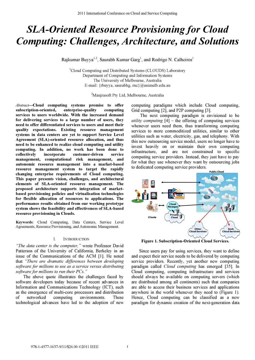 Cloud computing systems promise to offer subscription-oriented, enterprise-quality computing services to users worldwide. With the increased demand for delivering services to a large number of users, they need to offer differentiated services to users and meet their quality expectations. Existing resource management systems in data centers are yet to support Service Level Agreement (SLA)-oriented resource allocation, and thus need to be enhanced to realize cloud computing and utility computing. In addition, no work has been done to collectively incorporate customer-driven service management, computational risk management, and autonomic resource management into a market-based resource management system to target the rapidly changing enterprise requirements of Cloud computing. This paper presents vision, challenges, and architectural elements of SLA-oriented resource management. The proposed architecture supports integration of marketbased provisioning policies and virtualisation technologies for flexible allocation of resources to applications. The performance results obtained from our working prototype system shows the feasibility and effectiveness of SLA-based resource provisioning in Clouds.