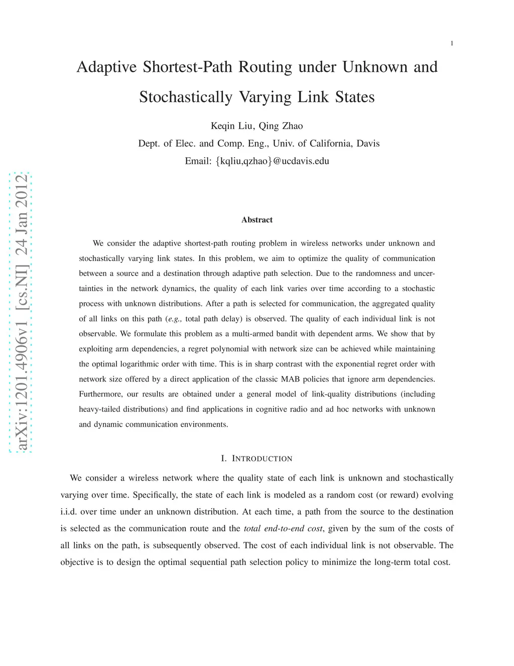 We consider the adaptive shortest-path routing problem in wireless networks under unknown and stochastically varying link states. In this problem, we aim to optimize the quality of communication between a source and a destination through adaptive path selection. Due to the randomness and uncertainties in the network dynamics, the quality of each link varies over time according to a stochastic process with unknown distributions. After a path is selected for communication, the aggregated quality of all links on this path (e.g., total path delay) is observed. The quality of each individual link is not observable. We formulate this problem as a multi-armed bandit with dependent arms. We show that by exploiting arm dependencies, a regret polynomial with network size can be achieved while maintaining the optimal logarithmic order with time. This is in sharp contrast with the exponential regret order with network size offered by a direct application of the classic MAB policies that ignore arm dependencies. Furthermore, our results are obtained under a general model of link-quality distributions (including heavy-tailed distributions) and find applications in cognitive radio and ad hoc networks with unknown and dynamic communication environments.