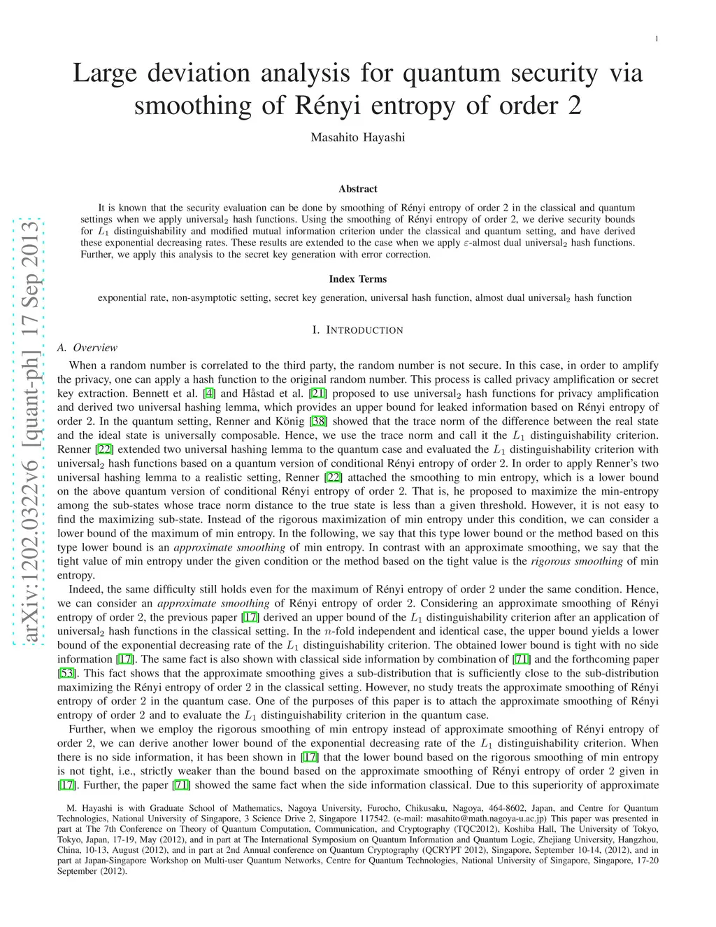Large deviation analysis for quantum security via smoothing of Renyi