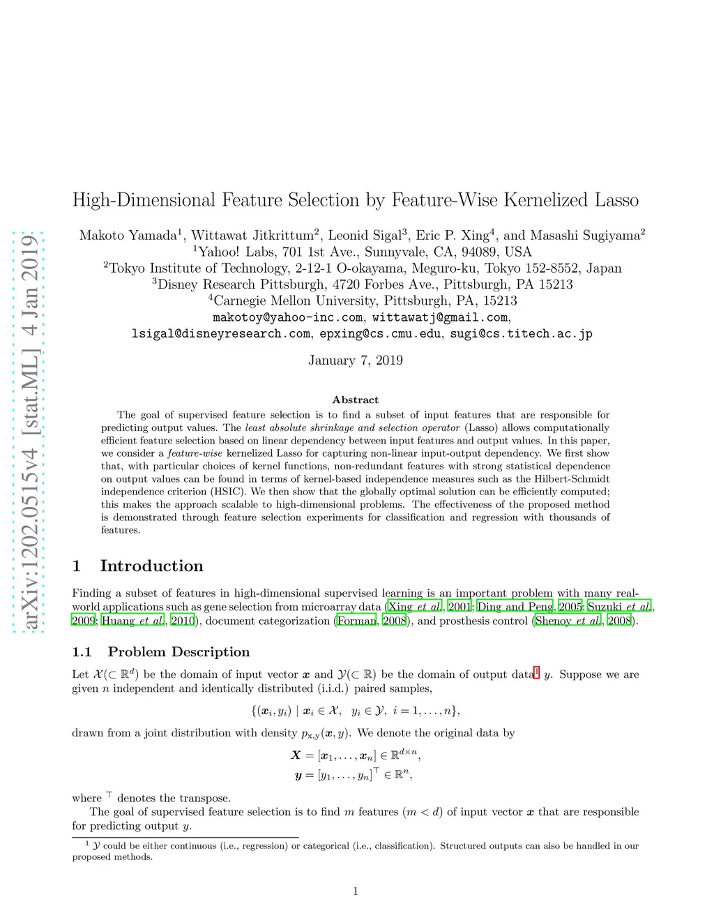 The goal of supervised feature selection is to find a subset of input features that are responsible for predicting output values. The least absolute shrinkage and selection operator (Lasso) allows computationally efficient feature selection based on linear dependency between input features and output values. In this paper, we consider a feature-wise kernelized Lasso for capturing non-linear input-output dependency. We first show that, with particular choices of kernel functions, non-redundant features with strong statistical dependence on output values can be found in terms of kernel-based independence measures. We then show that the globally optimal solution can be efficiently computed; this makes the approach scalable to high-dimensional problems. The effectiveness of the proposed method is demonstrated through feature selection experiments with thousands of features.