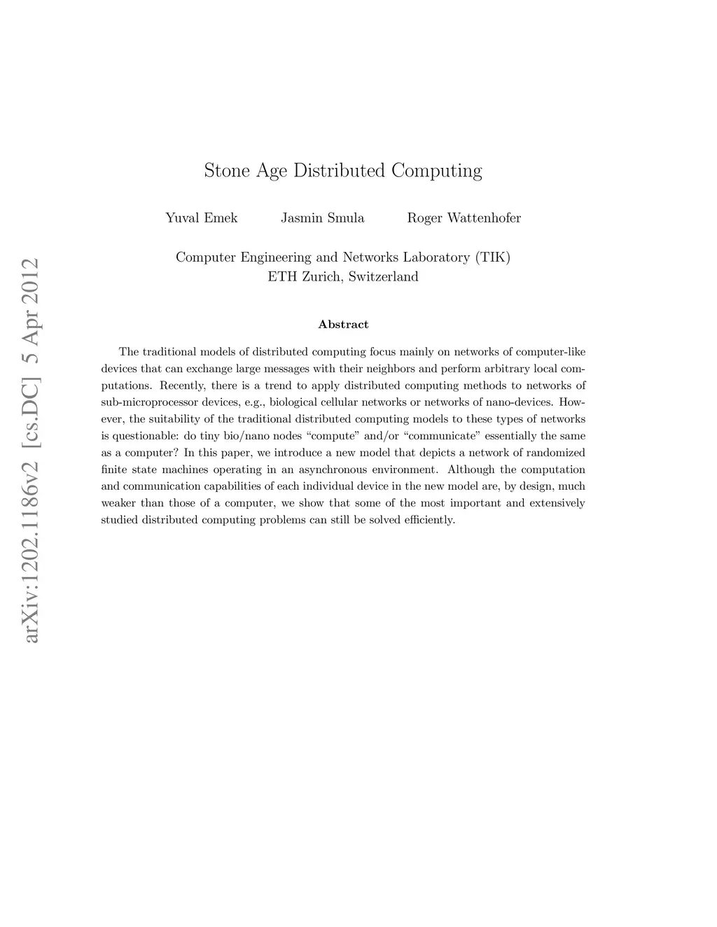 The traditional models of distributed computing focus mainly on networks of computer-like devices that can exchange large messages with their neighbors and perform arbitrary local computations. Recently, there is a trend to apply distributed computing methods to networks of sub-microprocessor devices, e.g., biological cellular networks or networks of nano-devices. However, the suitability of the traditional distributed computing models to these types of networks is questionable: do tiny bio/nano nodes "compute" and/or "communicate" essentially the same as a computer? In this paper, we introduce a new model that depicts a network of randomized finite state machines operating in an asynchronous environment. Although the computation and communication capabilities of each individual device in the new model are, by design, much weaker than those of a computer, we show that some of the most important and extensively studied distributed computing problems can still be solved efficiently.