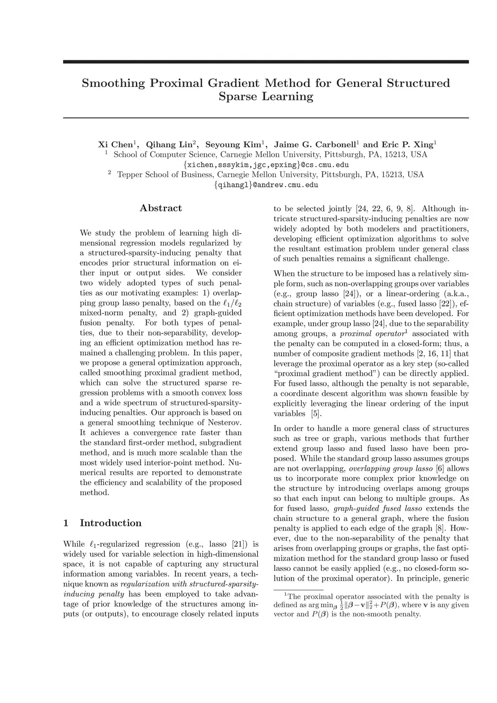 We study the problem of learning high dimensional regression models regularized by a structured-sparsity-inducing penalty that encodes prior structural information on either input or output sides. We consider two widely adopted types of such penalties as our motivating examples: 1) overlapping group lasso penalty, based on the l1/l2 mixed-norm penalty, and 2) graph-guided fusion penalty. For both types of penalties, due to their non-separability, developing an efficient optimization method has remained a challenging problem. In this paper, we propose a general optimization approach, called smoothing proximal gradient method, which can solve the structured sparse regression problems with a smooth convex loss and a wide spectrum of structured-sparsity-inducing penalties. Our approach is based on a general smoothing technique of Nesterov. It achieves a convergence rate faster than the standard first-order method, subgradient method, and is much more scalable than the most widely used interior-point method. Numerical results are reported to demonstrate the efficiency and scalability of the proposed method.