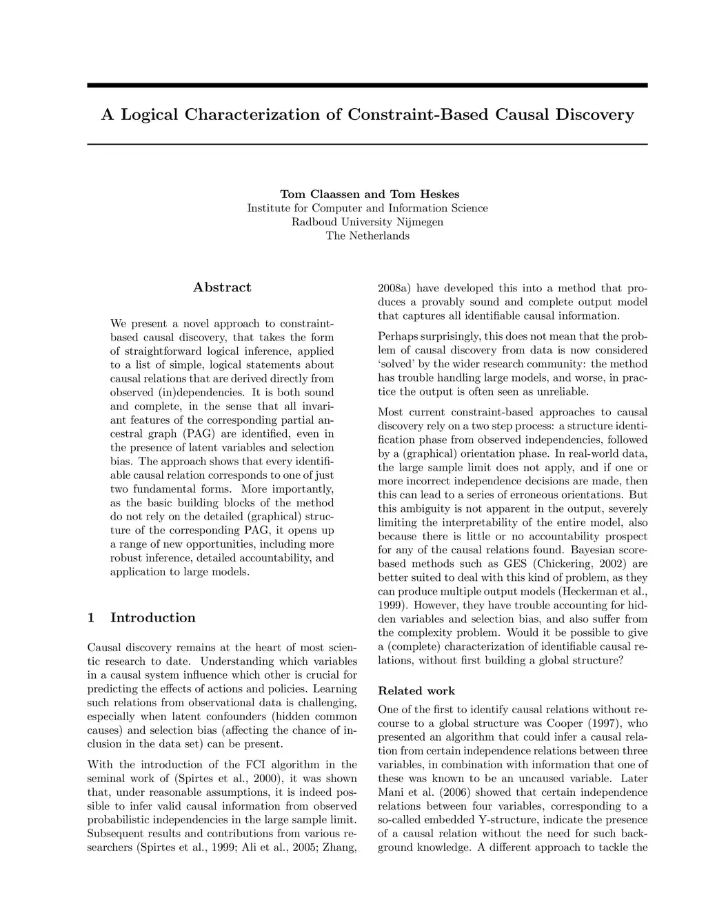 We present a novel approach to constraint-based causal discovery, that takes the form of straightforward logical inference, applied to a list of simple, logical statements about causal relations that are derived directly from observed (in)dependencies. It is both sound and complete, in the sense that all invariant features of the corresponding partial ancestral graph (PAG) are identified, even in the presence of latent variables and selection bias. The approach shows that every identifiable causal relation corresponds to one of just two fundamental forms. More importantly, as the basic building blocks of the method do not rely on the detailed (graphical) structure of the corresponding PAG, it opens up a range of new opportunities, including more robust inference, detailed accountability, and application to large models.