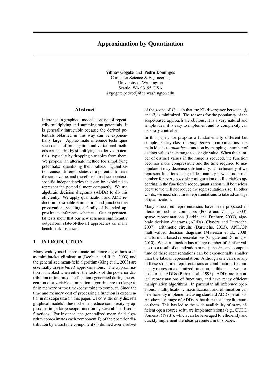 Inference in graphical models consists of repeatedly multiplying and summing out potentials. It is generally intractable because the derived potentials obtained in this way can be exponentially large. Approximate inference techniques such as belief propagation and variational methods combat this by simplifying the derived potentials, typically by dropping variables from them. We propose an alternate method for simplifying potentials: quantizing their values. Quantization causes different states of a potential to have the same value, and therefore introduces context-specific independencies that can be exploited to represent the potential more compactly. We use algebraic decision diagrams (ADDs) to do this efficiently. We apply quantization and ADD reduction to variable elimination and junction tree propagation, yielding a family of bounded approximate inference schemes. Our experimental tests show that our new schemes significantly outperform state-of-the-art approaches on many benchmark instances.