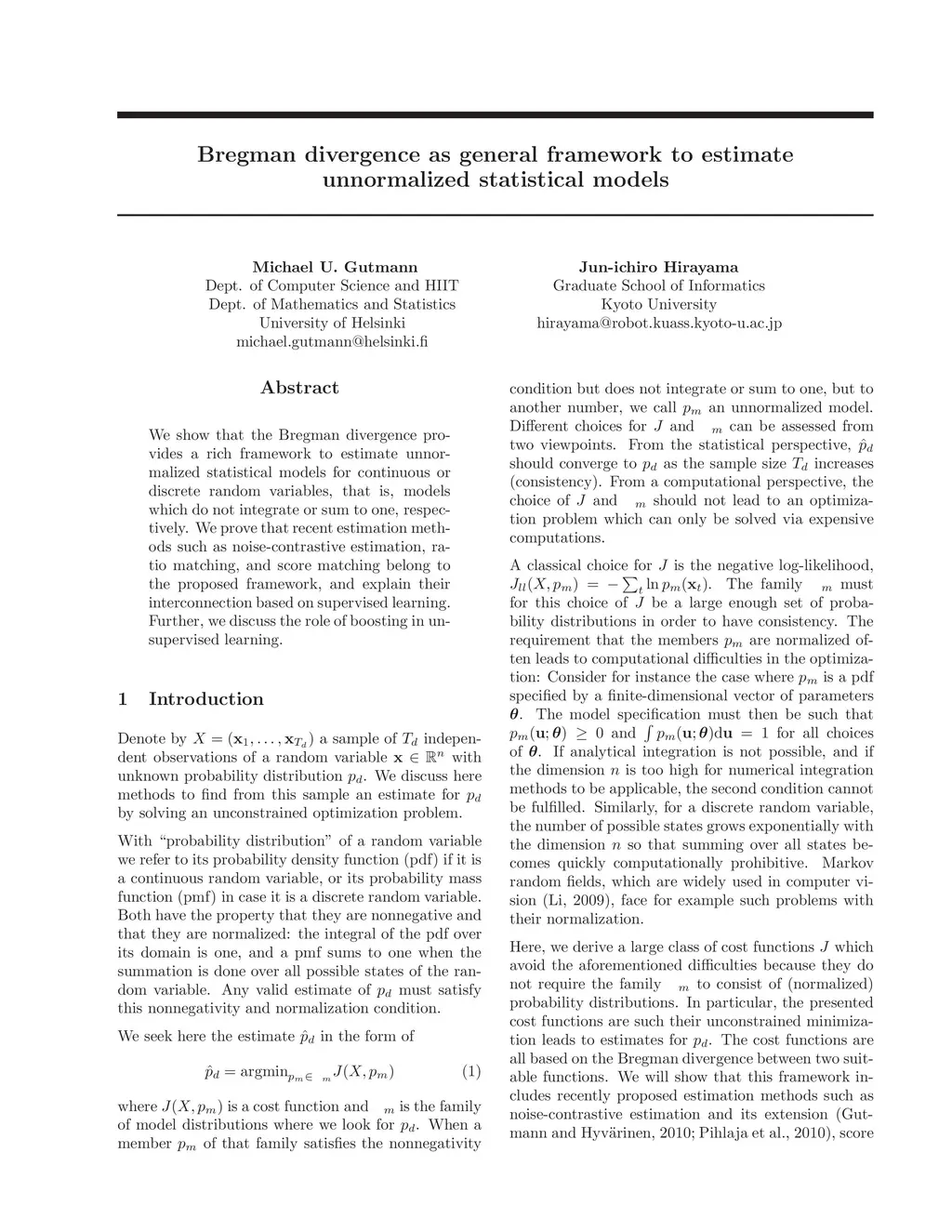 We show that the Bregman divergence provides a rich framework to estimate unnormalized statistical models for continuous or discrete random variables, that is, models which do not integrate or sum to one, respectively. We prove that recent estimation methods such as noise-contrastive estimation, ratio matching, and score matching belong to the proposed framework, and explain their interconnection based on supervised learning. Further, we discuss the role of boosting in unsupervised learning.