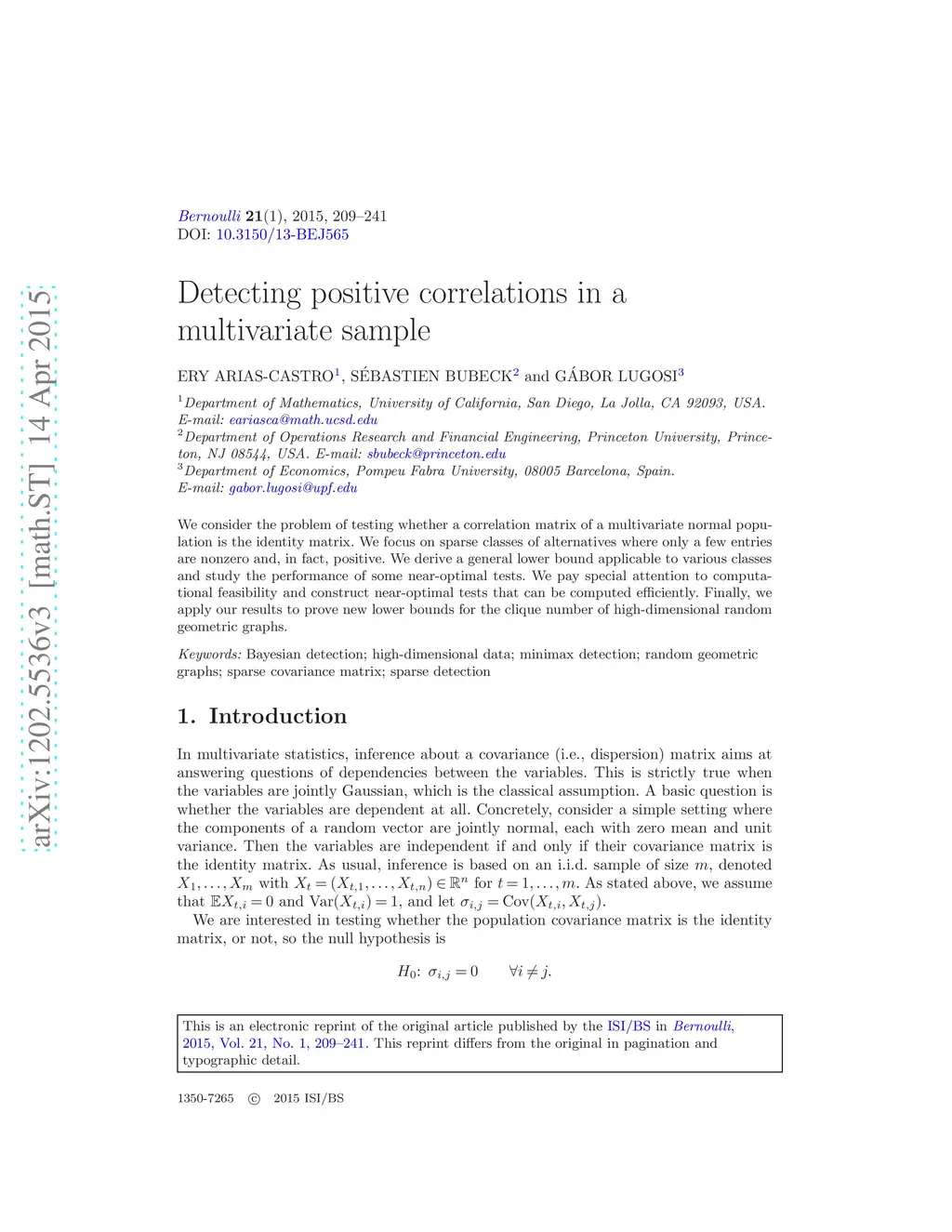 We consider the problem of testing whether a correlation matrix of a multivariate normal population is the identity matrix. We focus on sparse classes of alternatives where only a few entries are nonzero and, in fact, positive. We derive a general lower bound applicable to various classes and study the performance of some near-optimal tests. We pay special attention to computational feasibility and construct near-optimal tests that can be computed efficiently. Finally, we apply our results to prove new lower bounds for the clique number of high-dimensional random geometric graphs.