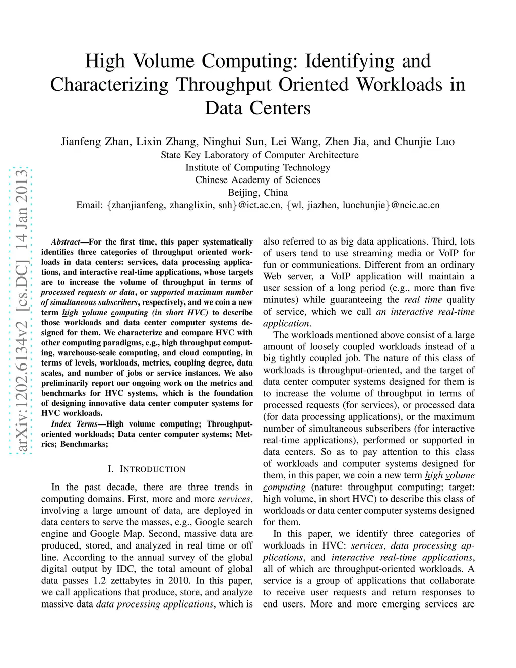 For the first time, this paper systematically identifies three categories of throughput oriented workloads in data centers: services, data processing applications, and interactive real-time applications, whose targets are to increase the volume of throughput in terms of processed requests or data, or supported maximum number of simultaneous subscribers, respectively, and we coin a new term high volume computing (in short HVC) to describe those workloads and data center computer systems designed for them. We characterize and compare HVC with other computing paradigms, e.g., high throughput computing, warehouse-scale computing, and cloud computing, in terms of levels, workloads, metrics, coupling degree, data scales, and number of jobs or service instances. We also preliminarily report our ongoing work on the metrics and benchmarks for HVC systems, which is the foundation of designing innovative data center computer systems for HVC workloads.