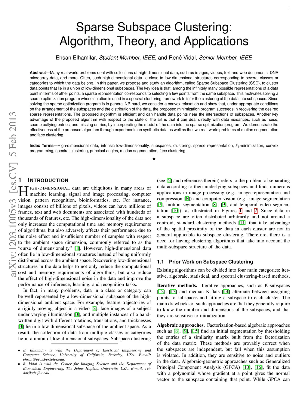Sparse Subspace Clustering: Algorithm, Theory, and Applications