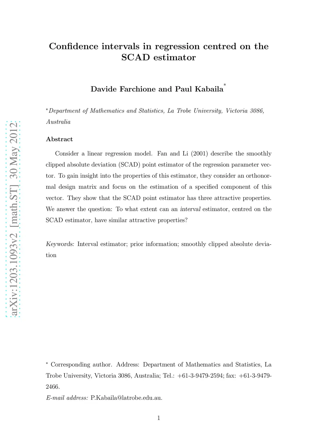 Consider a linear regression model. Fan and Li (2001) describe the smoothly clipped absolute deviation (SCAD) point estimator of the regression parameter vector. To gain insight into the properties of this estimator, they consider an orthonormal design matrix and focus on the estimation of a specified component of this vector. They show that the SCAD point estimator has three attractive properties. We answer the question: To what extent can an interval estimator, centred on the SCAD estimator, have similar attractive properties?