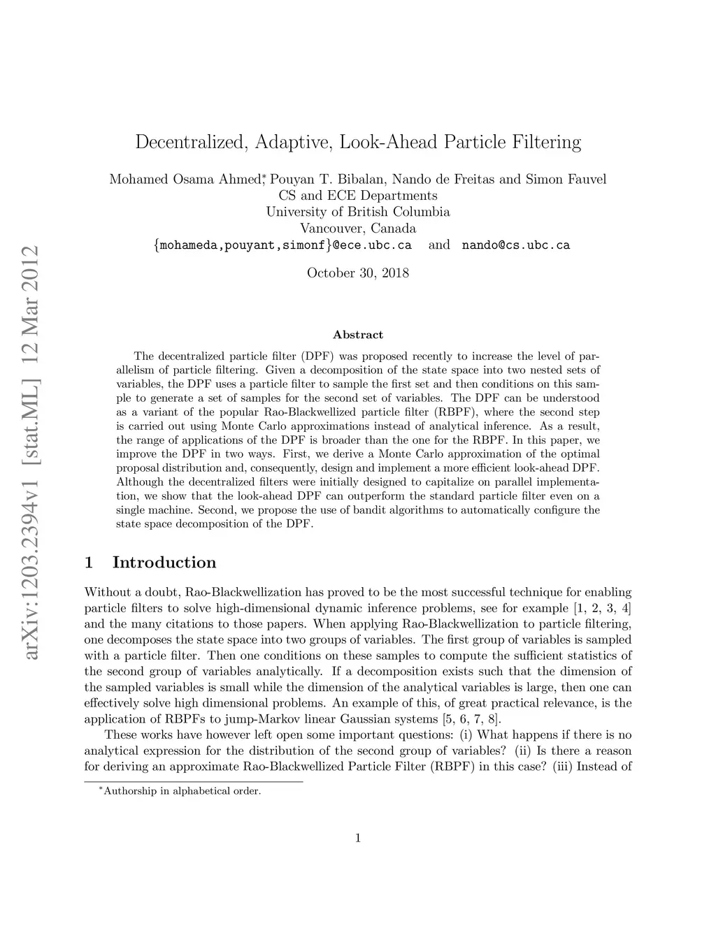 The decentralized particle filter (DPF) was proposed recently to increase the level of parallelism of particle filtering. Given a decomposition of the state space into two nested sets of variables, the DPF uses a particle filter to sample the first set and then conditions on this sample to generate a set of samples for the second set of variables. The DPF can be understood as a variant of the popular Rao-Blackwellized particle filter (RBPF), where the second step is carried out using Monte Carlo approximations instead of analytical inference. As a result, the range of applications of the DPF is broader than the one for the RBPF. In this paper, we improve the DPF in two ways. First, we derive a Monte Carlo approximation of the optimal proposal distribution and, consequently, design and implement a more efficient look-ahead DPF. Although the decentralized filters were initially designed to capitalize on parallel implementation, we show that the look-ahead DPF can outperform the standard particle filter even on a single machine. Second, we propose the use of bandit algorithms to automatically configure the state space decomposition of the DPF.