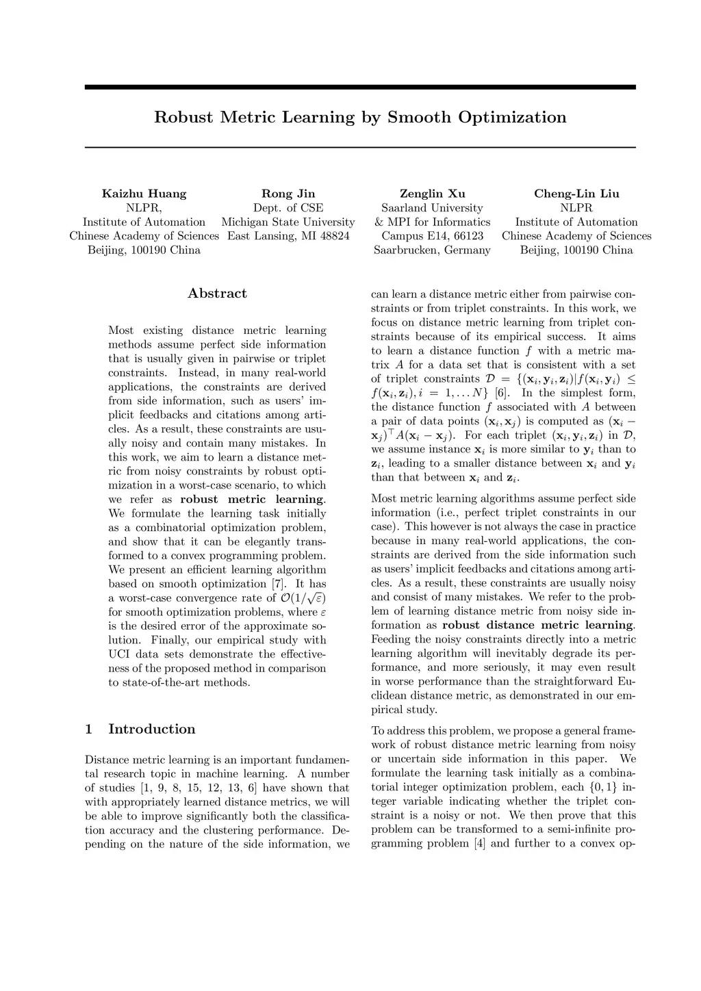 Most existing distance metric learning methods assume perfect side information that is usually given in pairwise or triplet constraints. Instead, in many real-world applications, the constraints are derived from side information, such as users' implicit feedbacks and citations among articles. As a result, these constraints are usually noisy and contain many mistakes. In this work, we aim to learn a distance metric from noisy constraints by robust optimization in a worst-case scenario, to which we refer as robust metric learning. We formulate the learning task initially as a combinatorial optimization problem, and show that it can be elegantly transformed to a convex programming problem. We present an efficient learning algorithm based on smooth optimization [7]. It has a worst-case convergence rate of O(1/{\surd}{\varepsilon}) for smooth optimization problems, where {\varepsilon} is the desired error of the approximate solution. Finally, our empirical study with UCI data sets demonstrate the effectiveness of the proposed method in comparison to state-of-the-art methods.