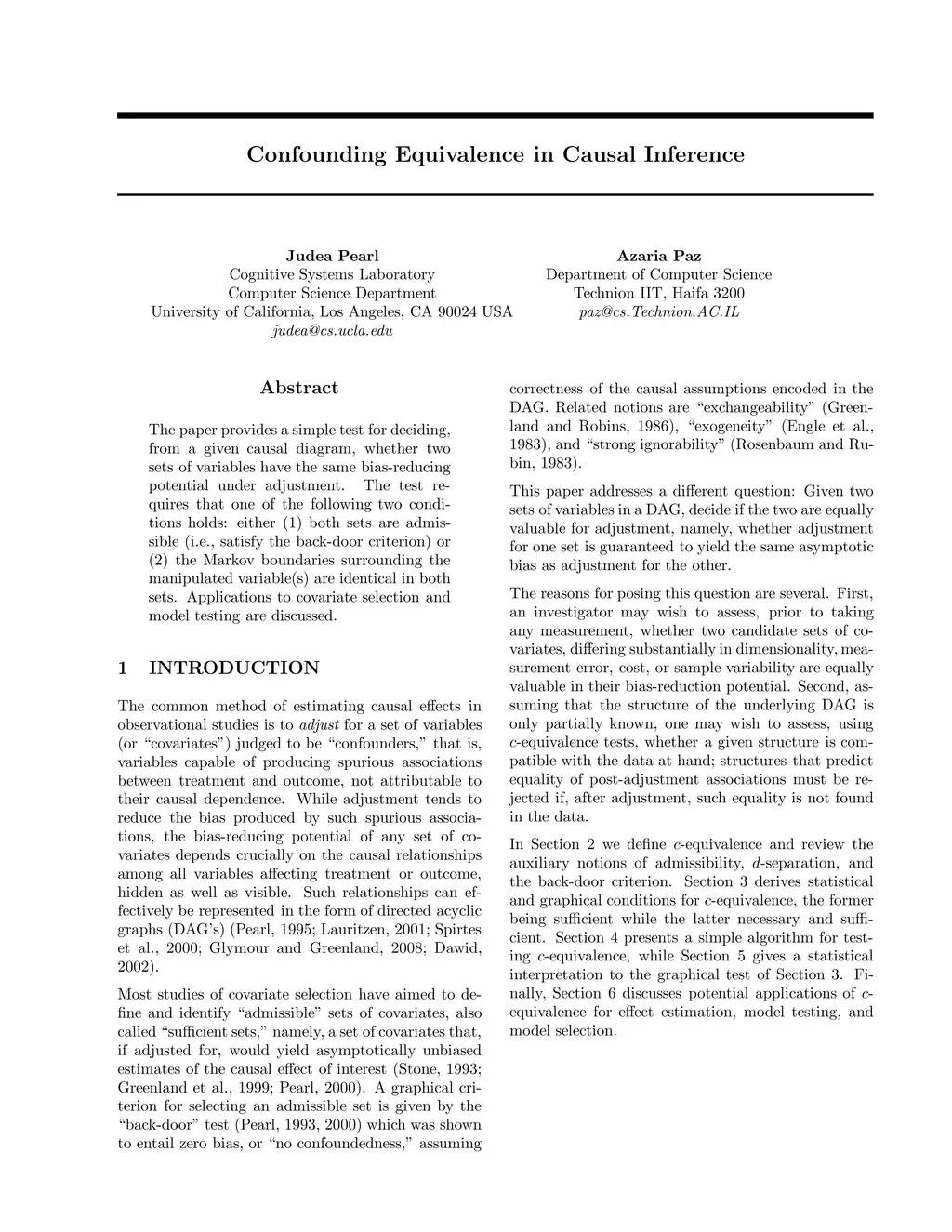 The paper provides a simple test for deciding, from a given causal diagram, whether two sets of variables have the same bias-reducing potential under adjustment. The test requires that one of the following two conditions holds: either (1) both sets are admissible (i.e., satisfy the back-door criterion) or (2) the Markov boundaries surrounding the manipulated variable(s) are identical in both sets. Applications to covariate selection and model testing are discussed.