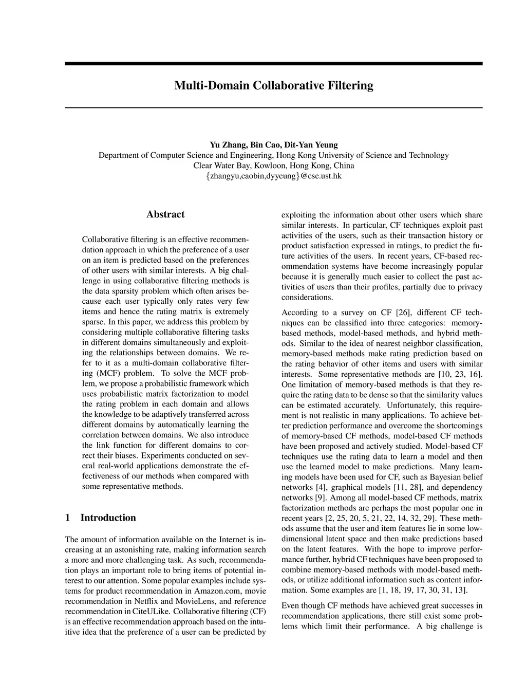 Collaborative filtering is an effective recommendation approach in which the preference of a user on an item is predicted based on the preferences of other users with similar interests. A big challenge in using collaborative filtering methods is the data sparsity problem which often arises because each user typically only rates very few items and hence the rating matrix is extremely sparse. In this paper, we address this problem by considering multiple collaborative filtering tasks in different domains simultaneously and exploiting the relationships between domains. We refer to it as a multi-domain collaborative filtering (MCF) problem. To solve the MCF problem, we propose a probabilistic framework which uses probabilistic matrix factorization to model the rating problem in each domain and allows the knowledge to be adaptively transferred across different domains by automatically learning the correlation between domains. We also introduce the link function for different domains to correct their biases. Experiments conducted on several real-world applications demonstrate the effectiveness of our methods when compared with some representative methods.
